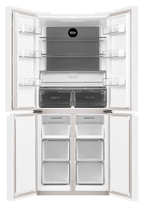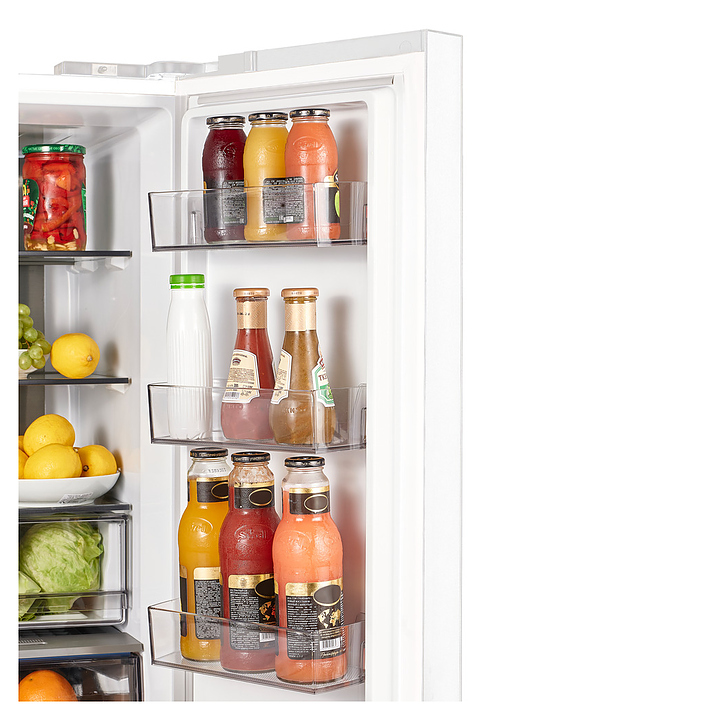 Холодильник Maunfeld MFF183NFWE типа Side-by-Side предназначен для охлаждения, замораживания, кратковременного и длительного хранения пищевых продуктов и напитков в гостиничных комплексах, офисах, а также домашних условиях. Модель состоит из холодильной камеры сверху и морозильной камеры с 2 изолированными отсеками снизу, оснащена 4 распашными дверьми, кабелем питания с евровилкой и расположенной на правой верхней двери сенсорной панелью управления с цифровым дисплеем. Фасад выполнен из стали с покрытием белого цвета и полным остеклением без винтового крепежа, внутренняя облицовка камер – из белого антибактериального пластика, плоские полки – из прозрачного закаленного стекла, навесные полки – из прозрачного пластика, поддоны морозильной камеры – из белого пластика, ящики – из белого пластика с прозрачным фронтом, плоские полки декорированы окантовками серебристого оттенка, упаковка – из гофрокартона, полимерной пленки и полистирола.