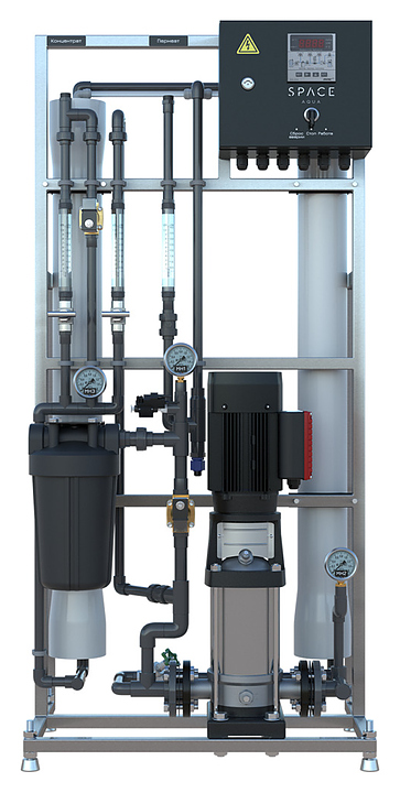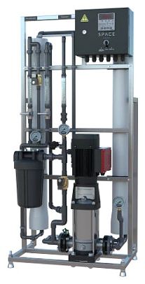 Установка обратного осмоса SpaceAqua Ocean-10011 0,50 используется на предприятиях общественного питания, торговли и промышленности различных направлений, в гостиничных комплексах, химчистках, автомойках, типографиях, животноводческих хозяйствах, а также загородных домах для высокоэффективной очистки исходной воды до рекомендуемого уровня. Обратный осмос – процесс, который заключается в фильтрации водных растворов под давлением, превышающем осмотическое, через полупроницаемую мембрану, пропускающую молекулы воды и задерживающую органические молекулы или ионы растворенных веществ, в процессе очистки поток разделяется на пермеат – очищенную воду для отвода в подготовленный резервуар и концентрат для сброса в канализацию или отвода на повторный цикл очистки. Рама системы выполнена из нержавеющей стали для возможности эксплуатации в условиях повышенной влажности, трубы – из поливинилхлорида, устойчивого к ультрафиолетовому излучению, кислотной и щелочной средам, напорные корпусы мембран – из композитных материалов.