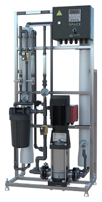 Установка обратного осмоса SpaceAqua Ocean-10004 0,50 используется на предприятиях общественного питания, торговли и промышленности различных направлений, в гостиничных комплексах, химчистках, автомойках, типографиях, животноводческих хозяйствах, а также загородных домах для высокоэффективной очистки исходной воды до рекомендуемого уровня. Обратный осмос – процесс, который заключается в фильтрации водных растворов под давлением, превышающем осмотическое, через полупроницаемую мембрану, пропускающую молекулы воды и задерживающую органические молекулы или ионы растворенных веществ, в процессе очистки поток разделяется на пермеат – очищенную воду для отвода в подготовленный резервуар и концентрат для сброса в канализацию или отвода на повторный цикл очистки. Рама системы выполнена из нержавеющей стали для возможности эксплуатации в условиях повышенной влажности, трубы – из поливинилхлорида, устойчивого к ультрафиолетовому излучению, кислотной и щелочной средам, напорные корпусы мембран – из композитных материалов.