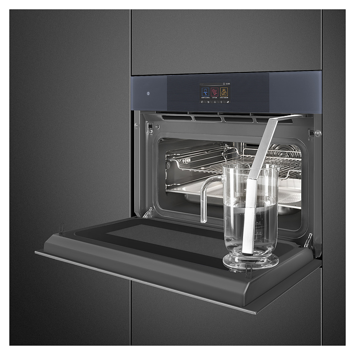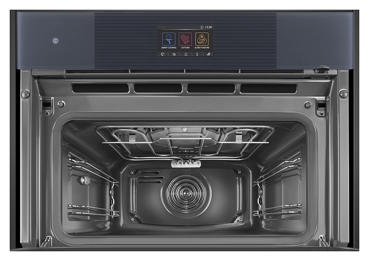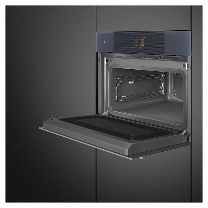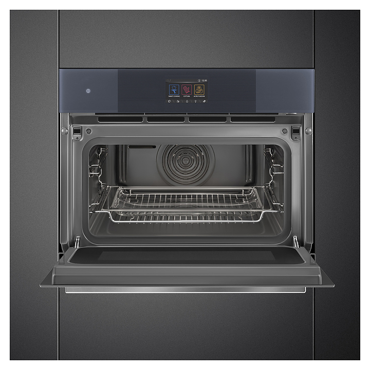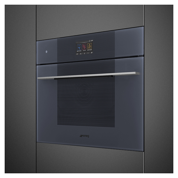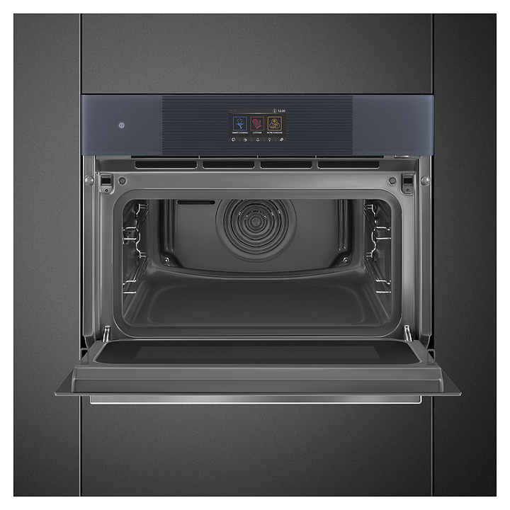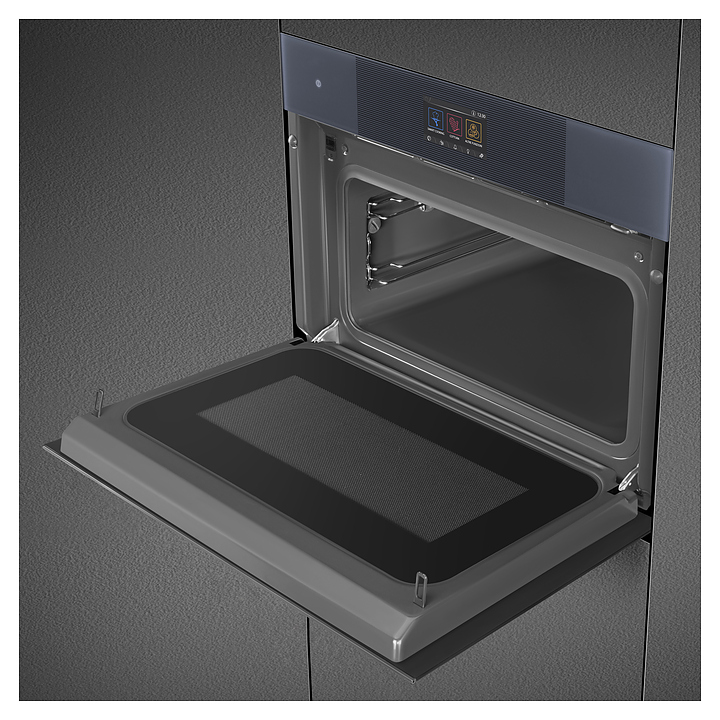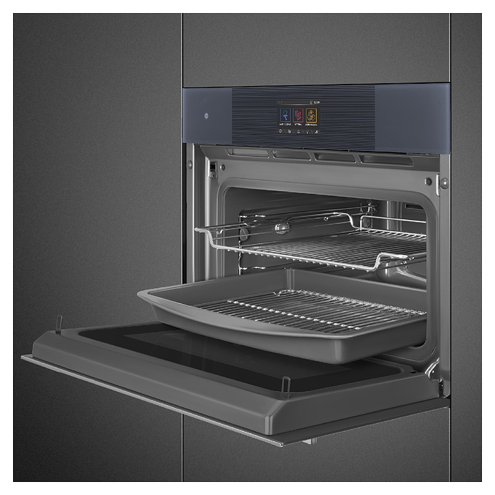 Электрический духовой шкаф SMEG SO4104APG предназначен для приготовления большого ассортимента блюд в домашних условиях. Модель оснащена просторной рабочей камерой Galileo с верхним и нижним нагревательными элементами, грилем, расположенными в задней стенке кольцевым нагревателем и вентилятором, магнетроном, парогенератором, 2 боковыми стойками с 2 уровнями направляющих для противней, откидной дверью со смотровым окном и длинной уплощенной горизонтальной рукояткой, сенсорной панелью управления и цветным TFT-дисплеем (VIVO Screen). Корпус выполнен из высококачественной стали, фронт двери и верхняя панель c матовым покрытием серого оттенка Neptune Grey и полным остеклением прозрачным стеклом без винтового крепежа, рукоятка – из металла с сатинированной серебристой поверхностью, глубокий противень – из стали с эмалированным покрытием, решетки, стандартный и перфорированный противни – из нержавеющей стали, противень для микроволн – из стекла, боковые стойки и направляющие – из стали с хромированной поверхностью.