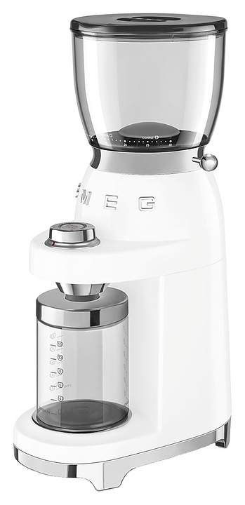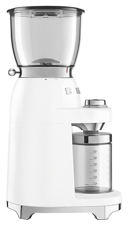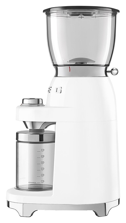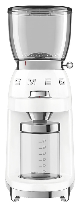 Электрическая кофемолка SMEG CGF11WHEU предназначена для приготовления молотого кофе из зерен в гостиницах, офисах и домашних условиях. Модель оснащена интегрированной подставкой для емкости с готовым продуктом, кабелем питания с вилкой и электромеханическим управлением. Корпус выполнен из нержавеющей стали с глянцевым внешним покрытием белого цвета и накладными объемными серебристыми литерами логотипа, жернова – из нержавеющей стали, рукоятка рычага – из стали SUS304 с серебристой поверхностью, основание, регулировочная ручка, крышка контейнера – из пластика с хромированной поверхностью, бункер и контейнер – из высокопрочного полимера Tritan Renew без содержания токсичных компонентов, крышка бункера, подставка для холдера (держателя фильтра) и щетка – из пластика, изоляция кабеля серого цвета.