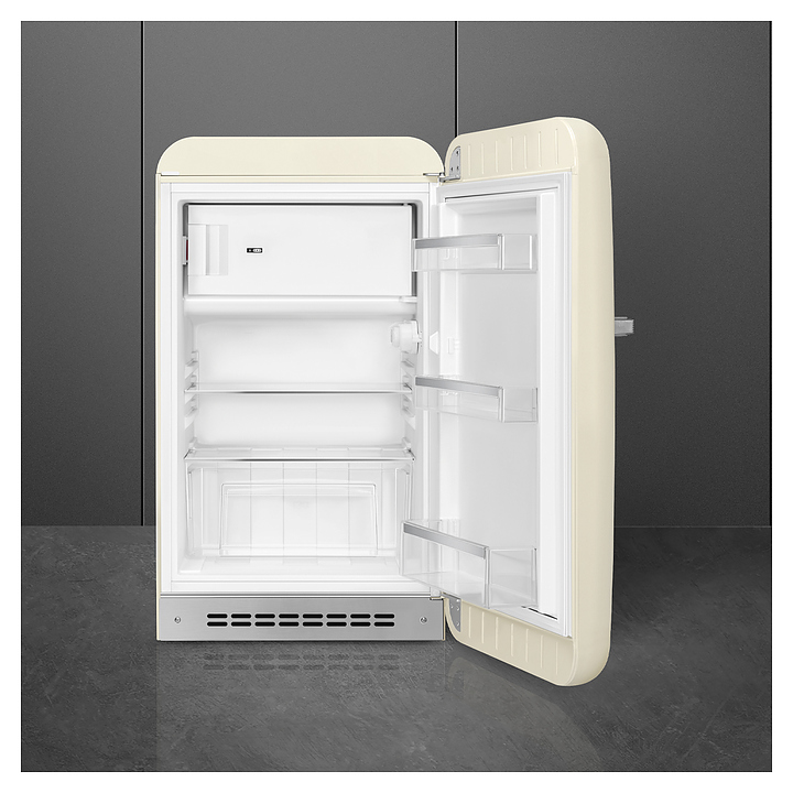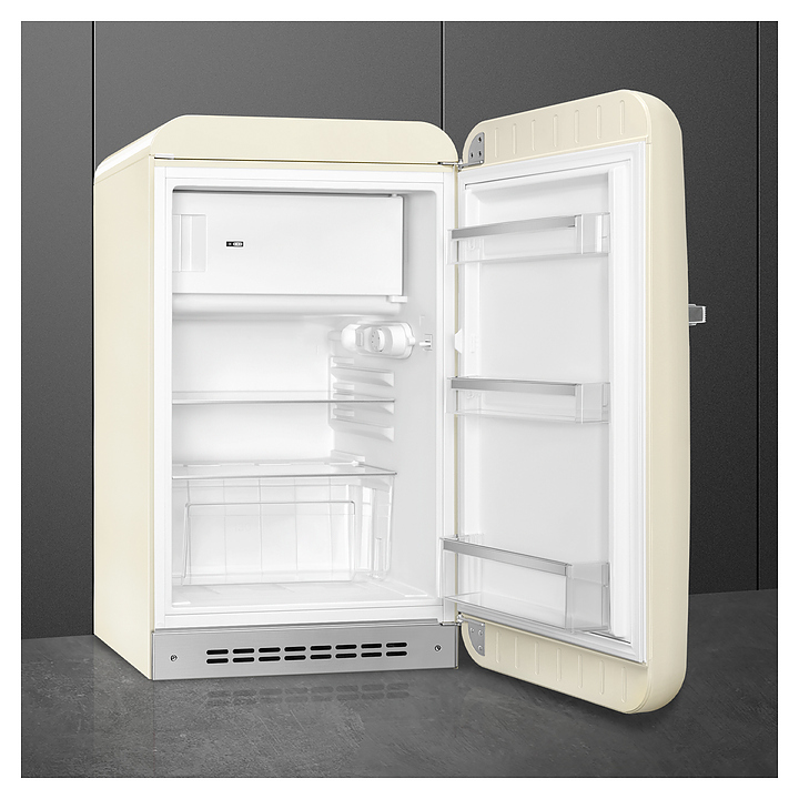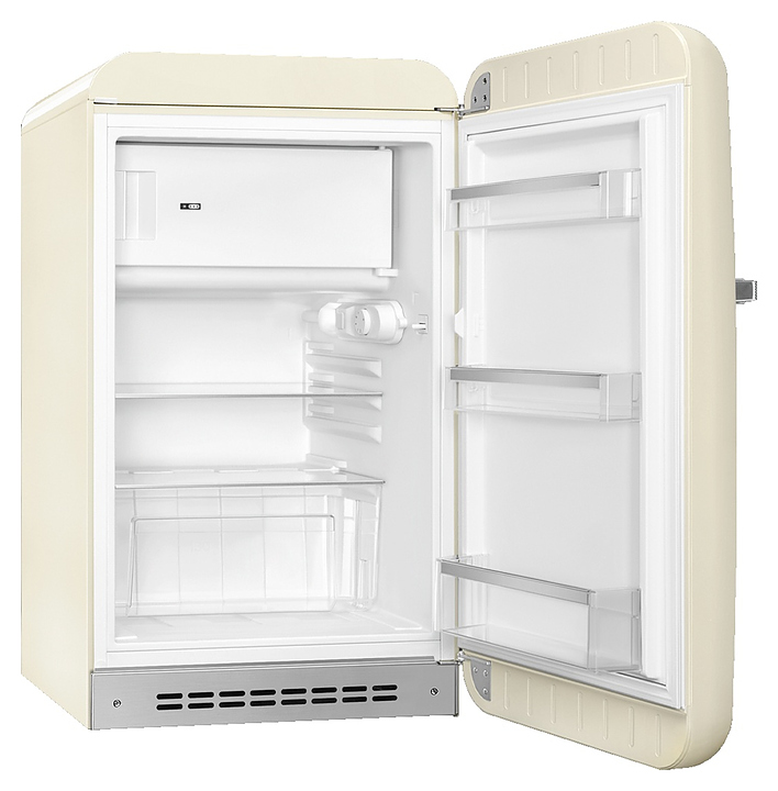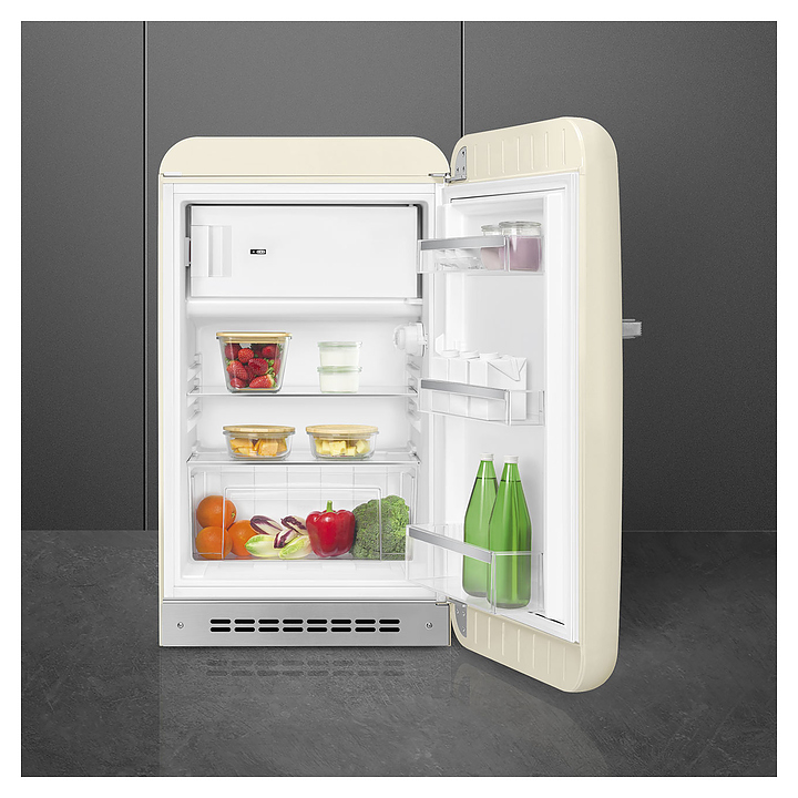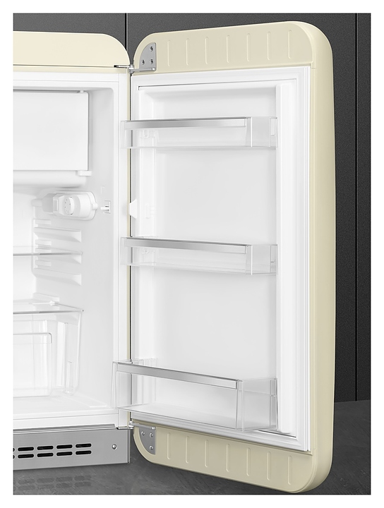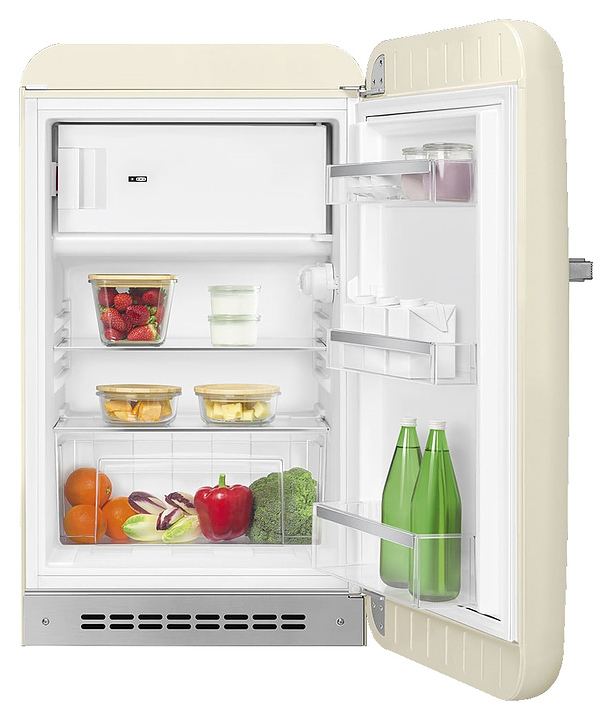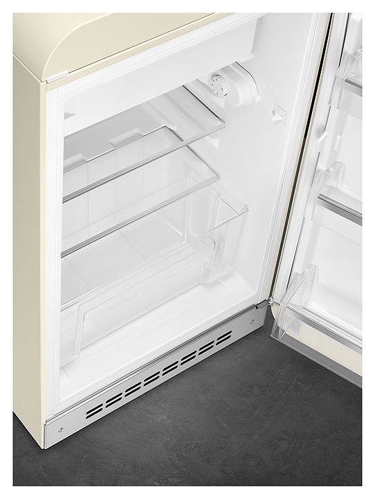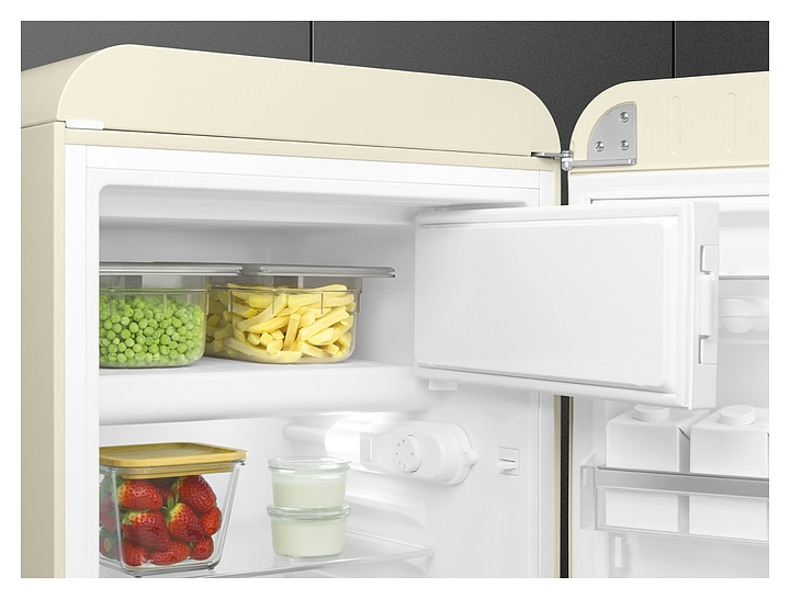 Холодильник SMEG FAB10RCR6 предназначен для охлаждения, заморозки, кратковременного и длительного хранения пищевых продуктов и напитков в гостиничных номерах, офисах, бытовых условиях и подсобных помещениях. Модель оснащена холодильной камерой с интегрированной в нее сверху морозильной камерой с распашной дверцей, цокольной решеткой, правосторонней распашной дверью с фиксированной горизонтальной рукояткой и накладными литерами логотипа в верхней части фронта, кабелем питания с евровилкой и расположенной в холодильной камере электромеханической панелью управления. Дверь выпуклой обтекаемой формы выполнена из термоформируемого полимера с глянцевой поверхностью кремового оттенка, боковины – из стали с антикоррозийным покрытием под цвет фронта, рукоятка и литеры логотипа с хромированным покрытием, внутренняя облицовка – из белого полимера, плоская полка и крышка ящика – из безопасного закаленного стекла, ящик и навесные полки – из прочного прозрачного полимера, окантовка полок – из металлического профиля с серебристой сатинированной поверхностью. Комплектация: