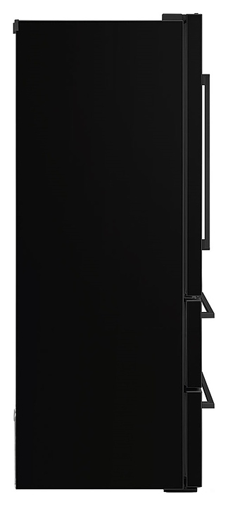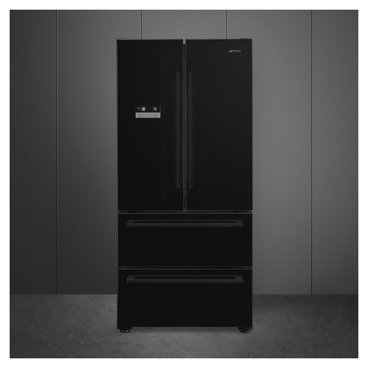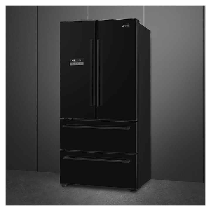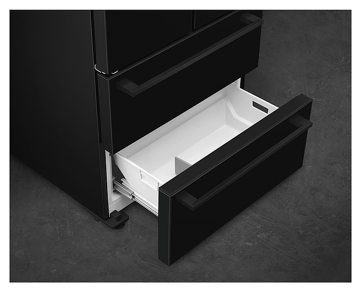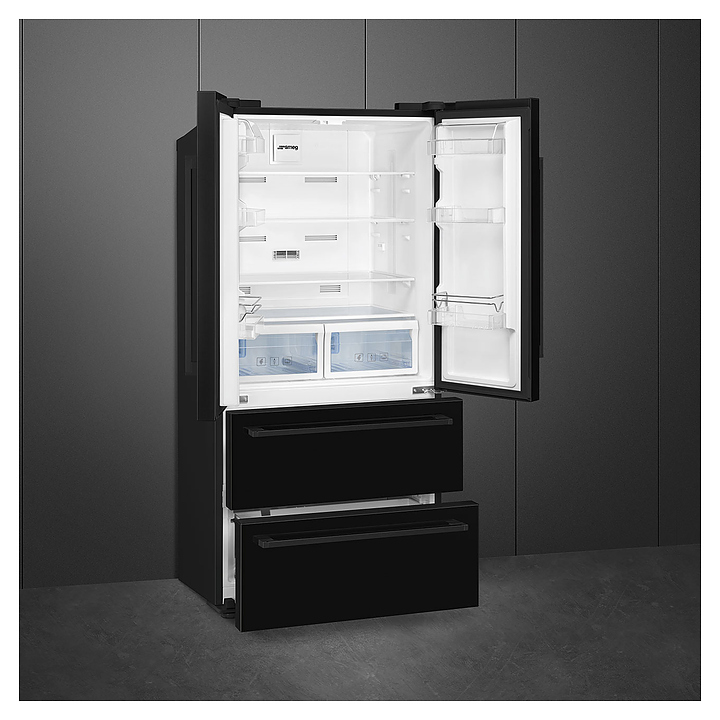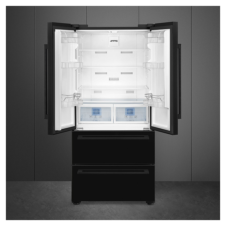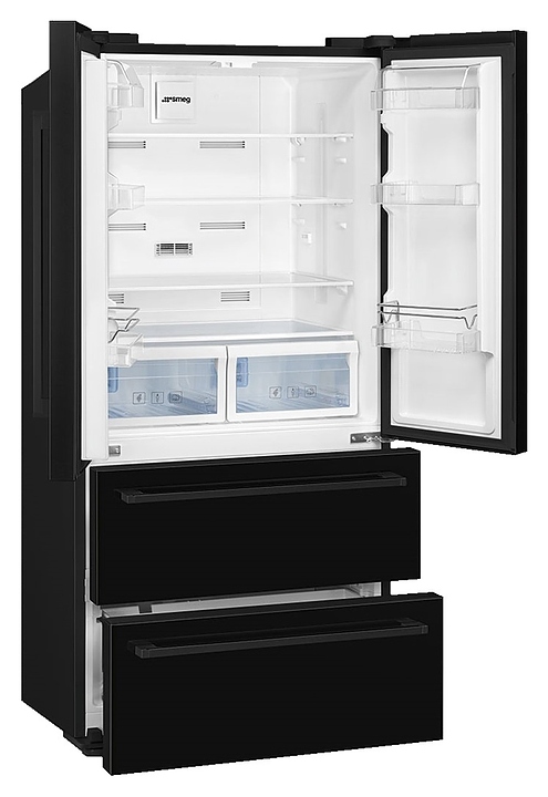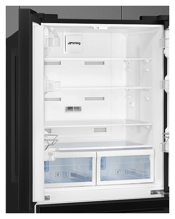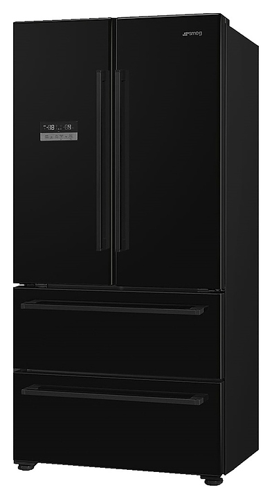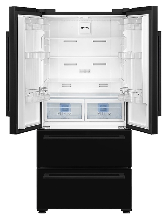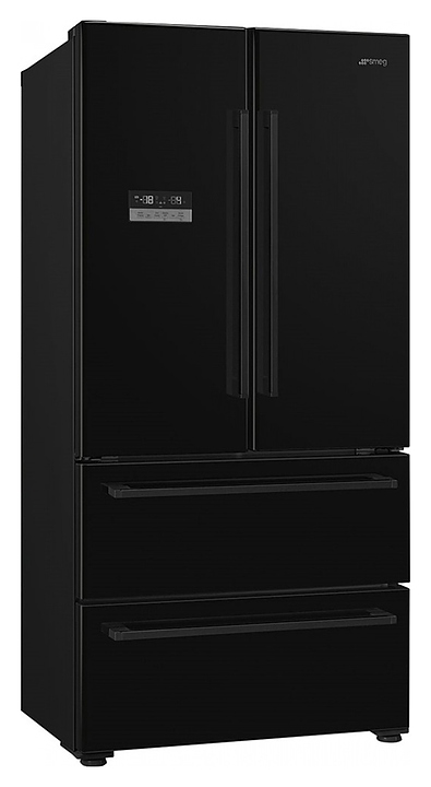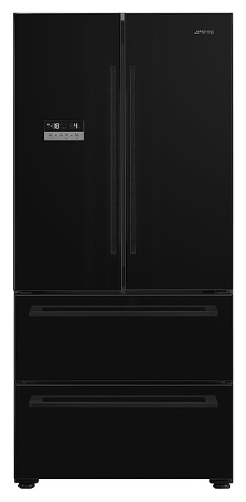 Холодильник SMEG FQ55FNDE предназначен для охлаждения, заморозки, кратковременного и длительного хранения пищевых продуктов и напитков в гостиницах, офисах и домашних условиях. Модель оснащена холодильной камерой сверху с 2 распашными дверьми с длинными вертикальными рукоятками, морозильной камерой снизу с выдвижными ящиками типа French Door с длинными горизонтальными рукоятками, кабелем питания с евровилкой, расположенной на фронте левой двери панелью управления с сенсорными функциональными клавишами и светодиодным монохромным дисплеем с белой подсветкой индикации. Корпус выполнен из стали с антикоррозийным покрытием черного цвета, облицовка интерьера – из белого пластика, плоские полки – из безопасного закаленного стекла, ящики и навесные полки – из прочного прозрачного полимера, рукоятки – из металла с черной поверхностью, окантовка полок и ящиков – из металлического профиля с сатинированной серебристой поверхностью.