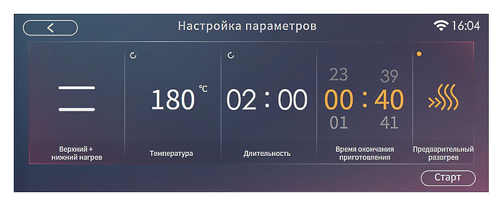 Символьная и текстовая индикация выбранного режима, активных функций и этапов приготовления