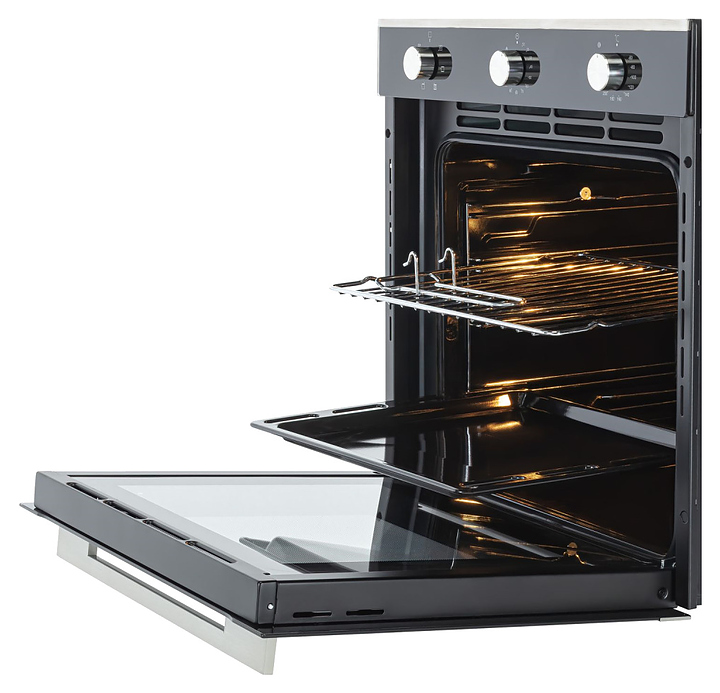 Встраиваемый электрический духовой шкаф Graude BE 60.2 E предназначен для приготовления большого ассортимента блюд в домашних условиях. Модель оснащена рабочей камерой с верхним и нижним нагревательными элементами, грилем, расположенным в задней стенке вентилятором, 2 боковыми стойками с 5 уровнями направляющих для противней, откидной дверью со смотровым окном и уплощенной горизонтальной рукояткой, кабелем питания и электромеханической панелью управления с 3 поворотными переключателями. Корпус выполнен из высококачественной стали, фронт с черным покрытием и частичным остеклением без винтового крепежа, горизонтальные вставки в верхней и нижней части фронта – из металла с сатинированной поверхностью цвета нержавеющей стали, рукоятка и переключатели – из алюминия с серебристой поверхностью, противень – из эмалированной стали, решетка, боковые стойки и направляющие с хромированной поверхностью. Комплектация: