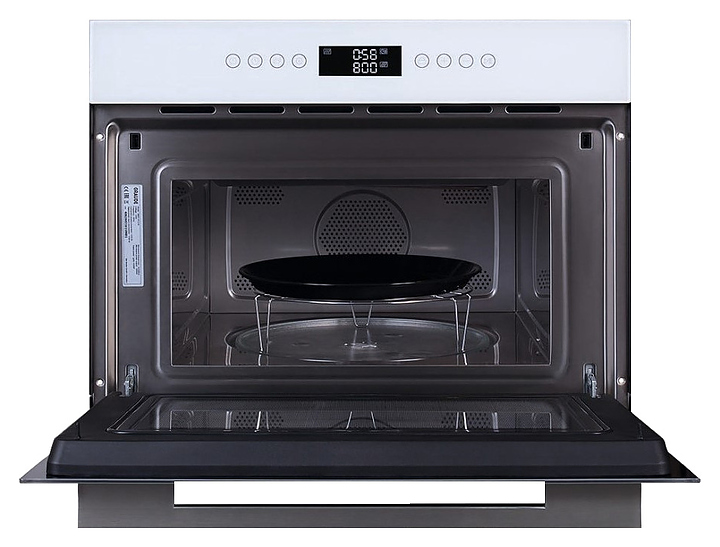 Встраиваемый электрический духовой шкаф Graude BWG 45.0 W предназначен для приготовления большого ассортимента блюд в домашних условиях. Модель оснащена рабочей камерой с расположенными в задней стенке вентилятором и кольцевым нагревательным элементом, верхним грилем, магнетроном, откидной дверью со смотровым окном и уплощенной горизонтальной рукояткой, кабелем питания, электронной панелью управления с функциональными сенсорными клавишами и жидкокристаллическим дисплеем индикации. Корпус выполнен из высококачественной стали, фронт с покрытием белого цвета и полным остеклением закаленным стеклом без винтового крепежа, внутренняя облицовка камеры – из нержавеющей стали, рукоятка – из металла с серебристой поверхностью, тарелка поворотного стола – из прочного стекла, решетка с хромированной поверхностью. Комплектация: