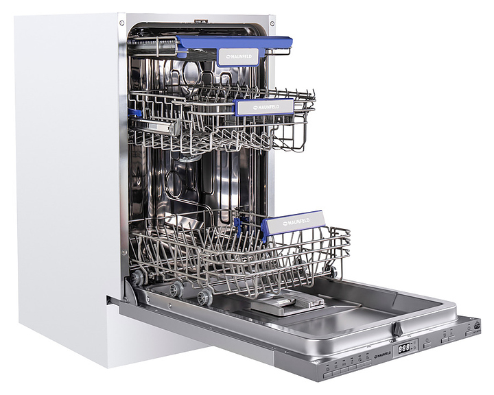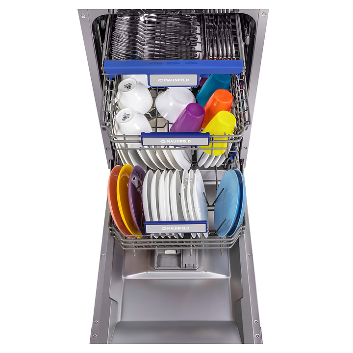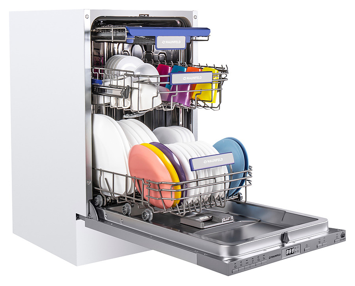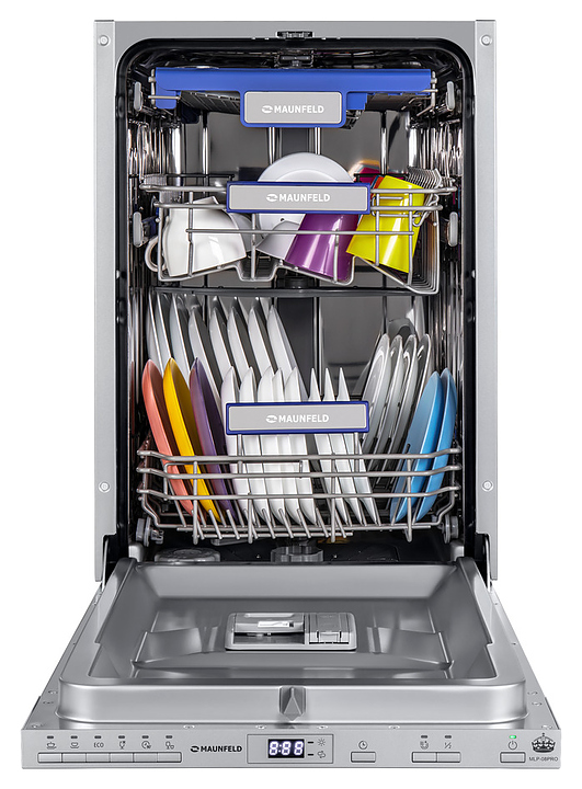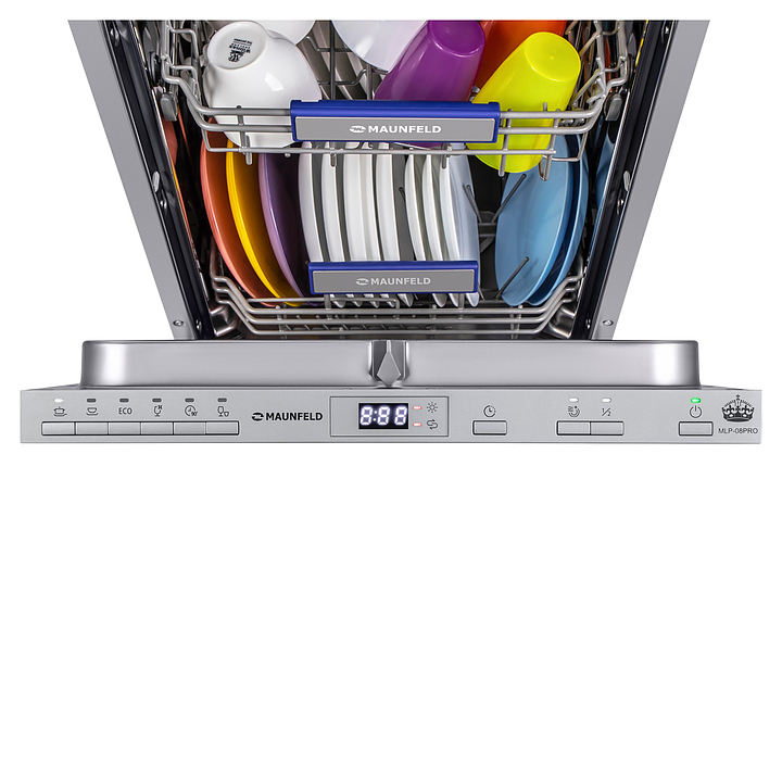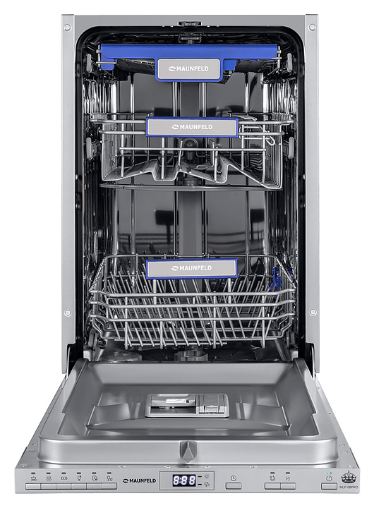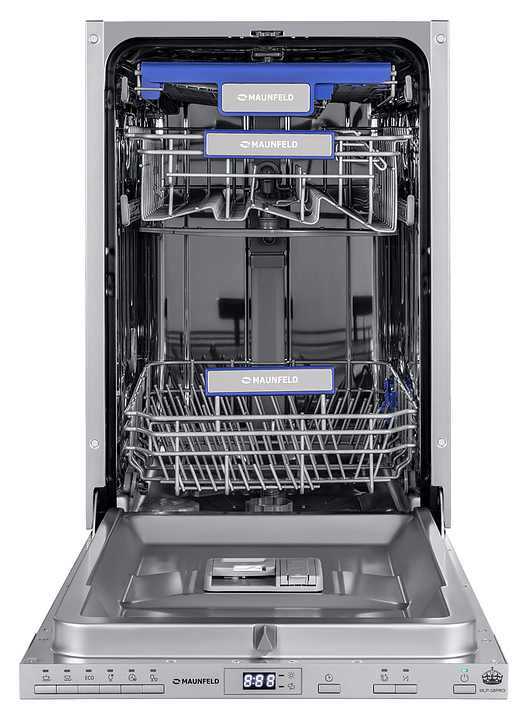 Встраиваемая посудомоечная машина Maunfeld MLP-08PROпредназначена для гигиенической обработки и последующей сушки различной посуды в гостиничных комплексах и домашних условиях. Модель оснащена камерой с откидной дверью с интегрированной рукояткой, верхним и нижним моечными рукавами, дозаторами моющих и ополаскивающих средств, устройством умягчения воды, кабелем питания с вилкой, расположенной на верхнем торце двери панелью управления с функциональными нажимными клавишами, светодиодными сигнальными лампами и цифровым дисплеем с белой подсветкой индикации. Внутренняя облицовка камеры и двери выполнена из высококачественной нержавеющей стали марок AISI304 и AISI430, корпус – из металла с антикоррозийным покрытием, панель управления – из полимера серого цвета.