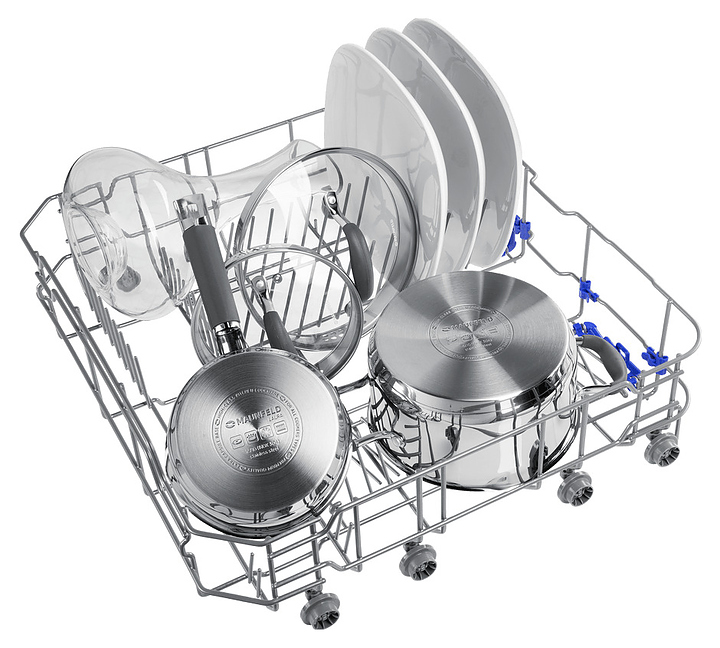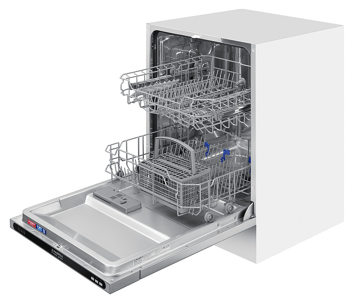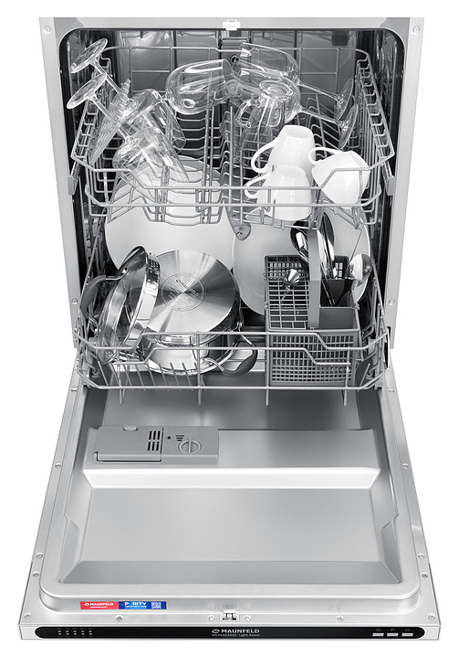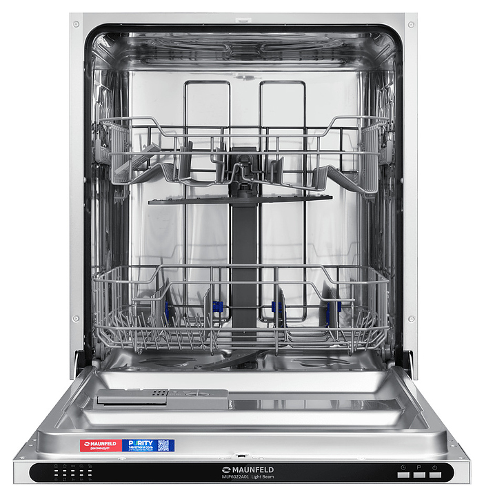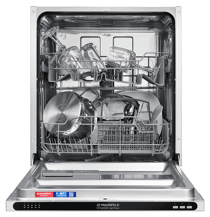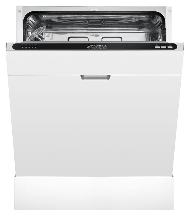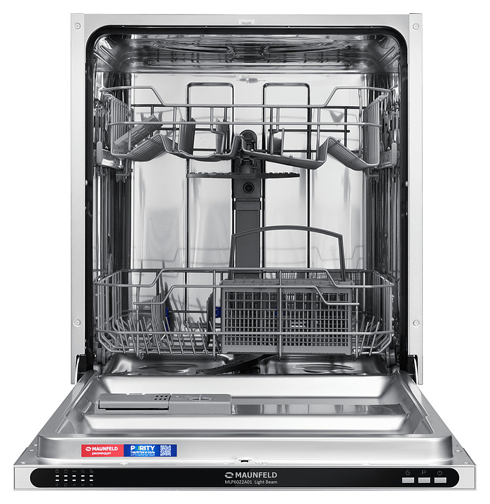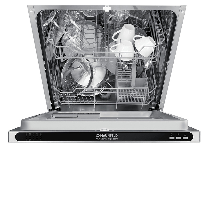Встраиваемая посудомоечная машина Maunfeld MLP6022A01 Light Beamпредназначена для гигиенической обработки и последующей сушки различной посуды в гостиничных комплексах и домашних условиях. Модель оснащена камерой с откидной дверью с интегрированной рукояткой, верхним и нижним моечными рукавами, дозаторами моющих и ополаскивающих средств, устройством умягчения воды, кабелем питания с вилкой, расположенной на верхнем торце двери панелью управления с функциональными нажимными клавишами и светодиодными сигнальными лампами с белой подсветкой индикации. Внутренняя облицовка камеры и двери выполнена из высококачественной нержавеющей стали марок AISI304 и AISI430, корпус – из металла с антикоррозийным покрытием, панель управления – из полимера черного цвета.