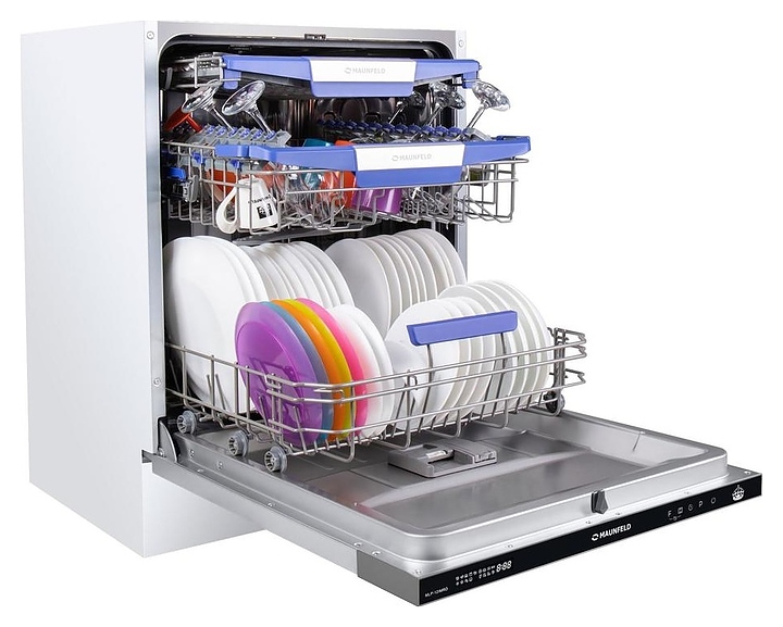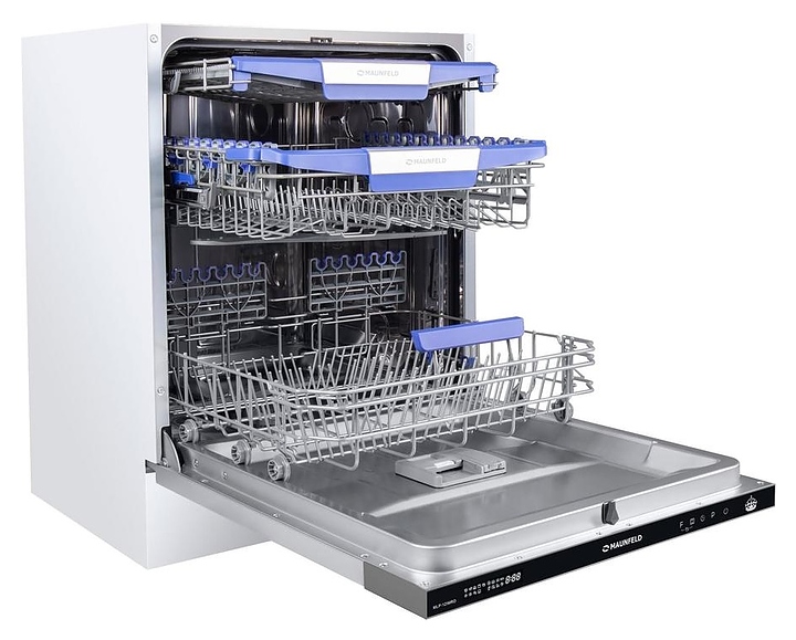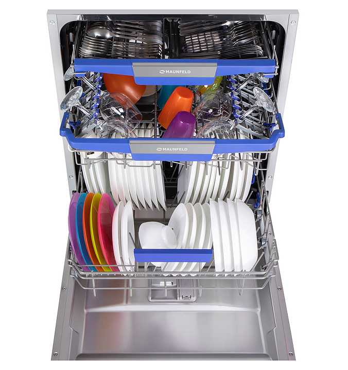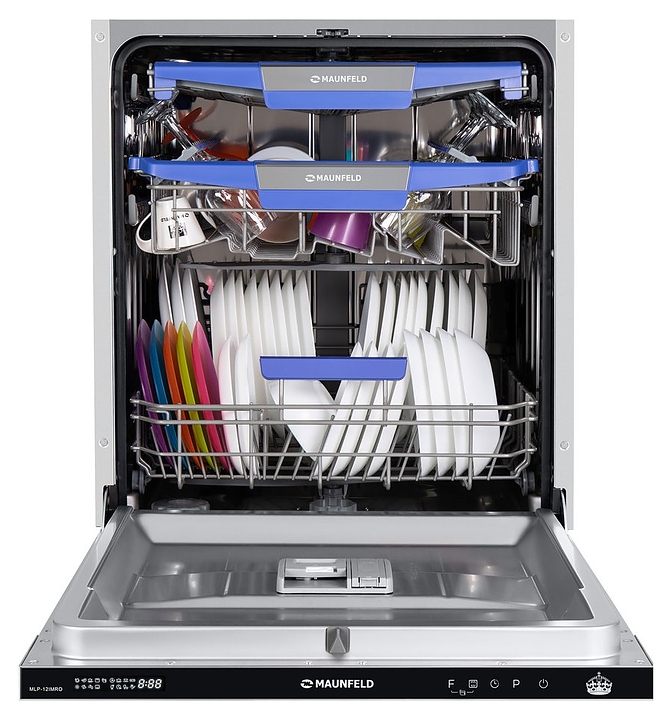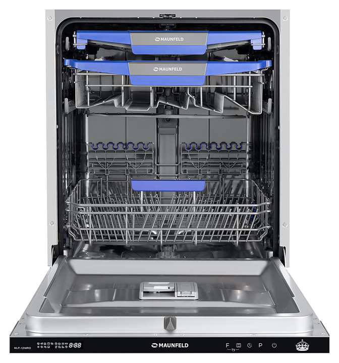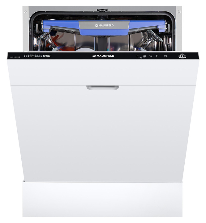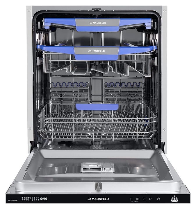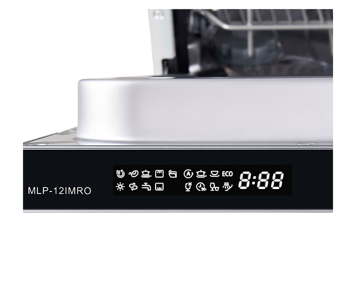 Встраиваемая посудомоечная машина Maunfeld MLP-12IMROпредназначена для гигиенической обработки и последующей сушки различной посуды в гостиничных комплексах и домашних условиях. Модель оснащена камерой с откидной дверью с интегрированной рукояткой, верхним и нижним моечными рукавами, дозаторами моющих и ополаскивающих средств, устройством умягчения воды, кабелем питания с вилкой, расположенной на верхнем торце двери панелью управления с функциональными сенсорными клавишами, светодиодным дисплеем с цифровыми и символьными сегментами с белой подсветкой индикации. Внутренняя облицовка камеры и двери выполнена из высококачественной нержавеющей стали марок AISI304 и AISI430, корпус – из металла с антикоррозийным покрытием, панель управления – из полимера черного цвета.