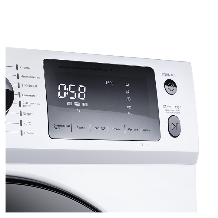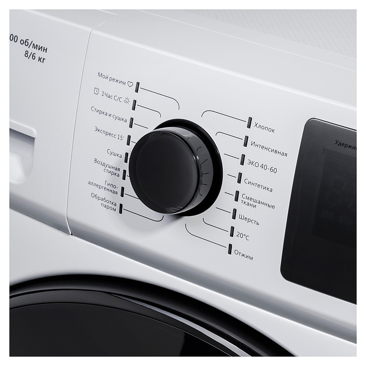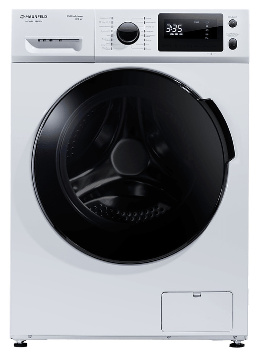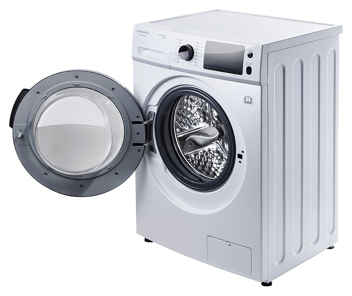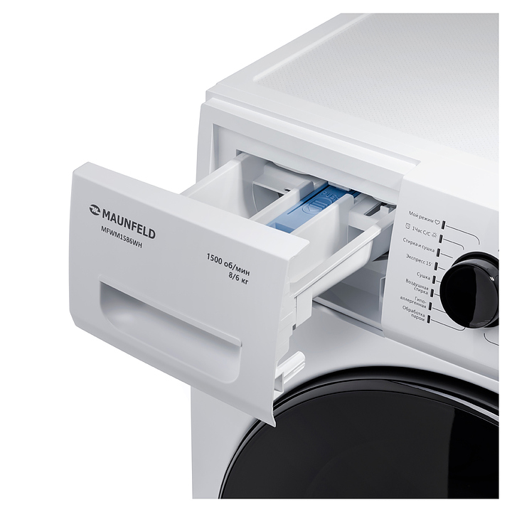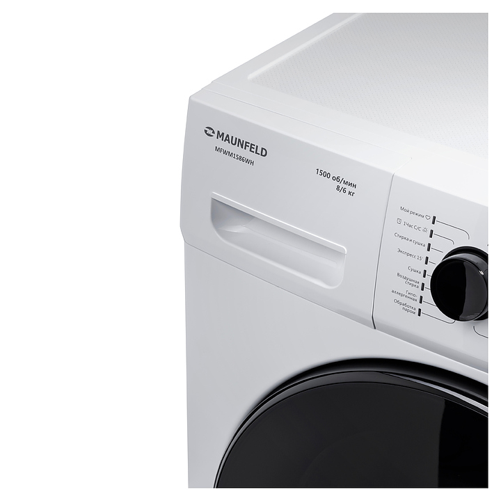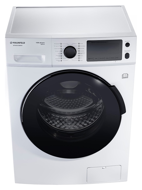 Стирально-сушильная машина Maunfeld MFWM1586WH используется в домашних условиях, а также небольших прачечных и гостиничных комплексах для стирки, полоскания, отжима и сушки белья, одежды и тканей. Модель оснащена фронтальным загрузочным люком, левосторонней дверью люка со смотровым окном, съемным контейнером для моющих средств с 3 отсеками, кабелем питания с вилкой, электромеханической панелью управления с поворотным переключателем программ, функциональными нажимными кнопками, сенсорными клавишами, светодиодными сигнальными лампами и жидкокристаллическим дисплеем с белой подсветкой индикации. Корпус выполнен из металла с антикоррозийным покрытием серебристого оттенка, внешняя крышка двери люка – из стекла с полупрозрачной дымчатой тонировкой и окантовкой черного цвета, барабан – из высококачественной нержавеющей стали, сенсорная панель, кнопки и переключатель с черной глянцевой поверхностью.