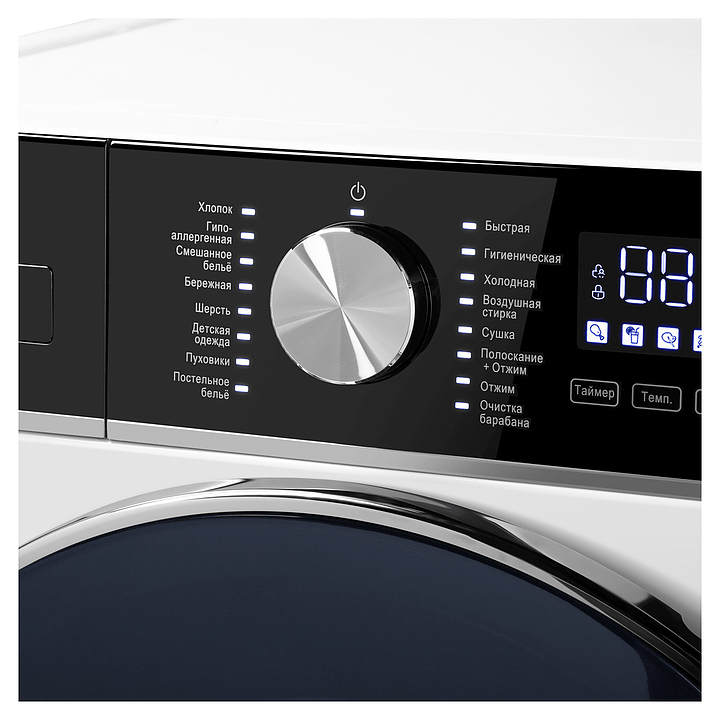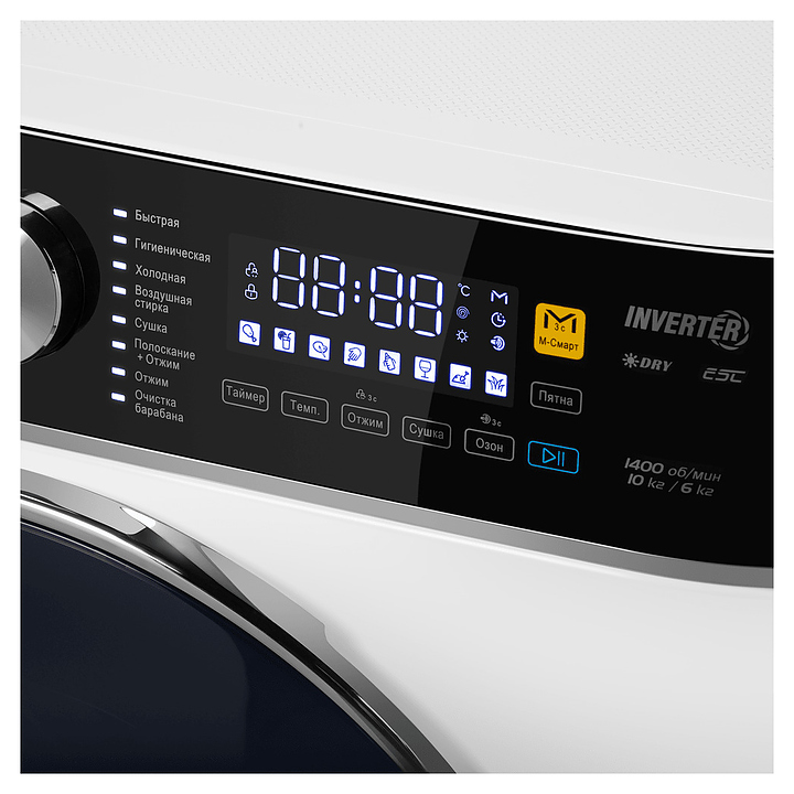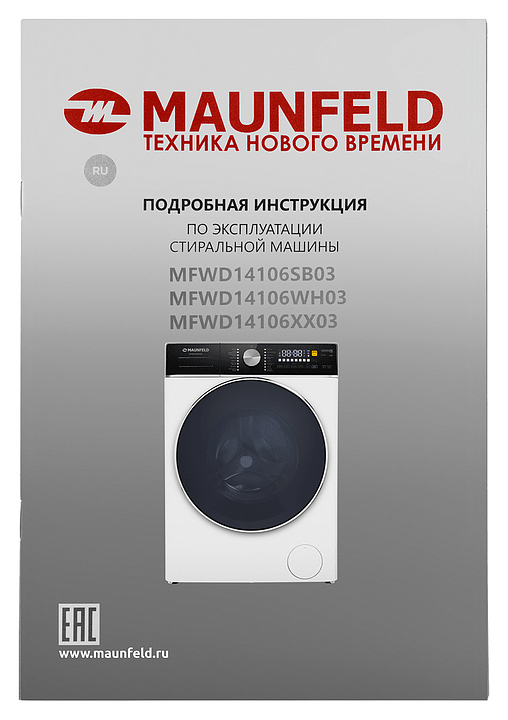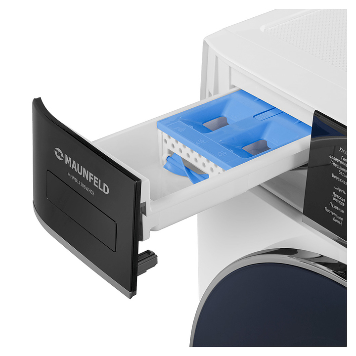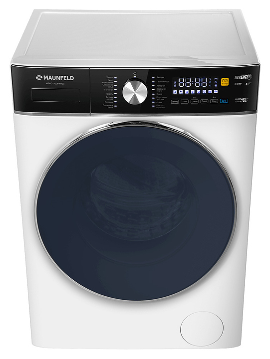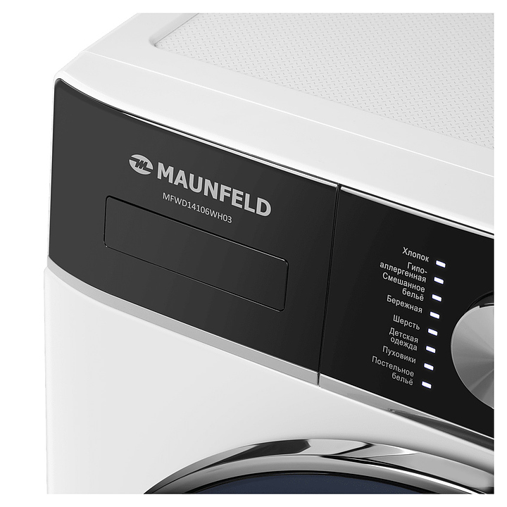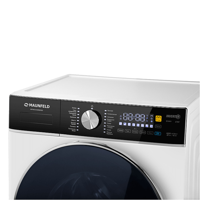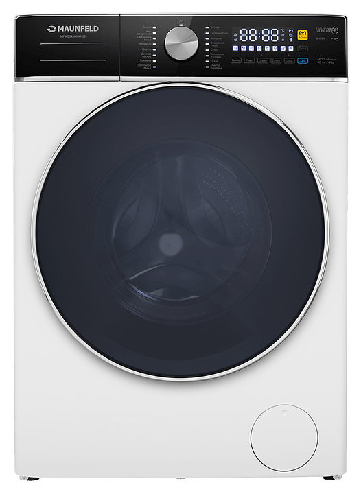 Стирально-сушильная машина Maunfeld MFWD14106WH03 используется в домашних условиях, а также небольших прачечных для стирки, полоскания, отжима и сушки белья, одежды и тканей. Модель оснащена фронтальным загрузочным люком, левосторонней дверью люка со смотровым окном, кабелем питания с вилкой, электромеханической панелью управления с поворотным переключателем программ, функциональными сенсорными клавишами, светодиодными сигнальными лампами и информативным жидкокристаллическим дисплеем с белой подсветкой индикации. Корпус выполнен из металла с антикоррозийным покрытием белого цвета, внешняя крышка двери люка – из стекла с полупрозрачной дымчатой тонировкой и декоративной окантовкой серебристого цвета, барабан – из высококачественной нержавеющей стали, верхняя фронтальная панель с черной глянцевой поверхностью, переключатель с серебристой поверхностью.