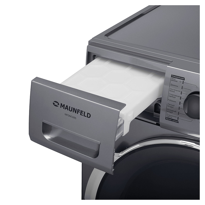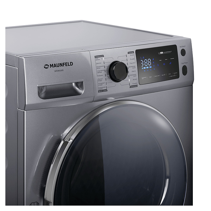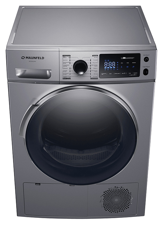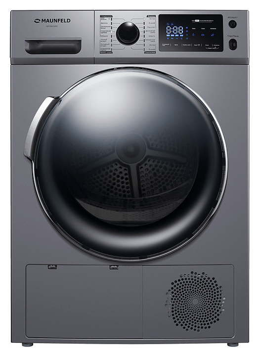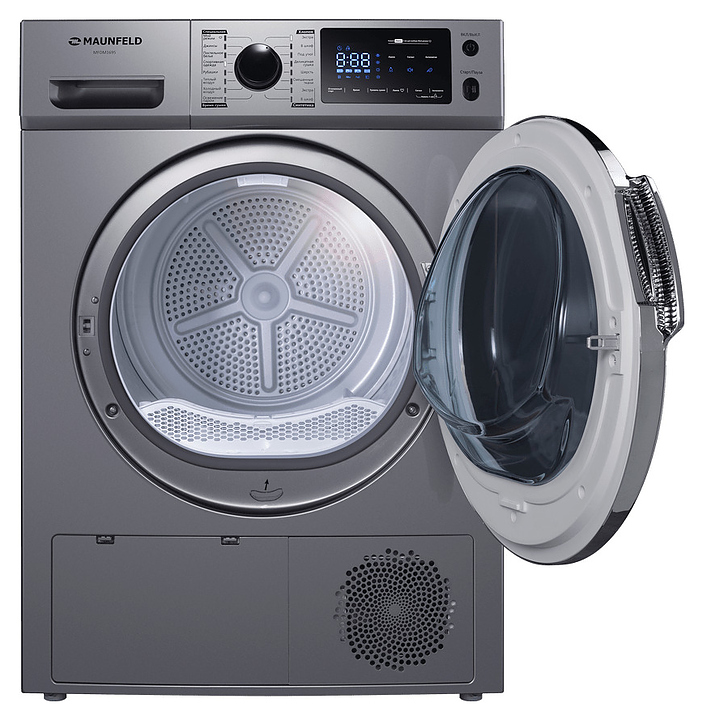 Сушильная машина Maunfeld MFDM169S используется в домашних условиях, а также небольших прачечных для сушки одежды, белья и тканей после стирки. Модель оснащена фронтальным загрузочным люком, правосторонней дверью люка со смотровым окном, тепловым насосом, кабелем питания с вилкой, электромеханической панелью управления с поворотным переключателем программ, функцирнальными нажимными кнопками, сенсорными клавишами, светодиодными сигнальными лампами и большим информативным дисплеем с голубой подсветкой индикации. Корпус выполнен из металла с антикоррозийным покрытием серебристого оттенка и декоративной перфорацией воздухозаборной решетки, внешняя крышка двери люка – из стекла с полупрозрачной дымчатой тонировкой и хромированной окантовкой, барабан – из высококачественной нержавеющей стали, сенсорная панель, кнопки и переключатель с черной глянцевой поверхностью.