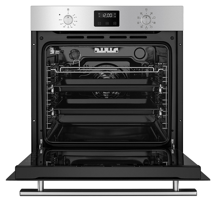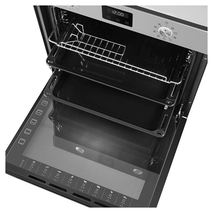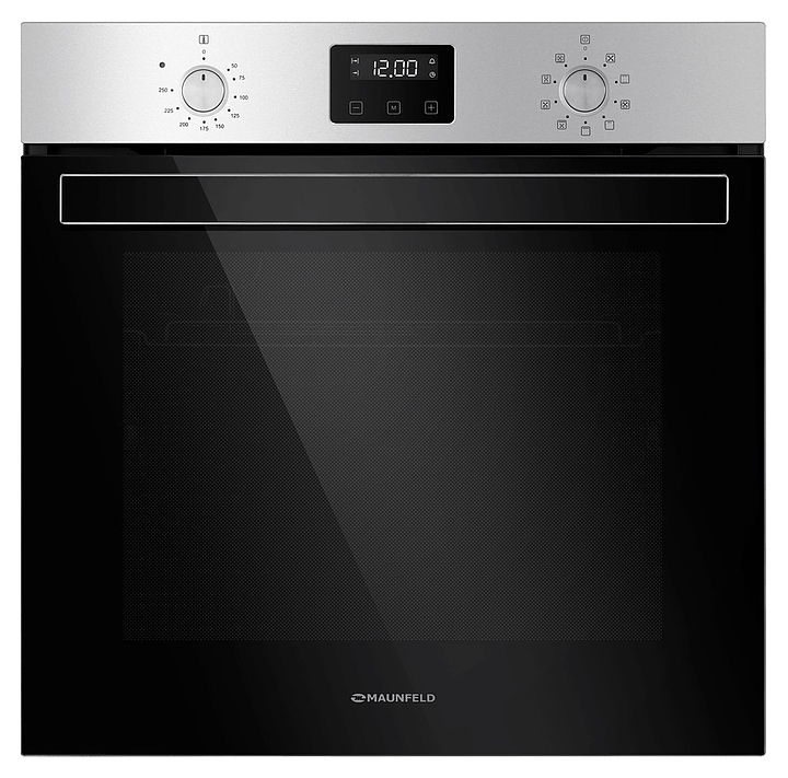 Встраивамый электрический духовой шкаф Maunfeld EOEM.769S1 предназначен для приготовления большого ассортимента блюд в домашних условиях. Модель оснащена камерой с расположенными в задней стенке кольцевым нагревательным элементом и вентилятором, верхним и нижним нагревательными элементами, верхним грилем, 2 боковыми стойками с 6 уровнями направляющих для противней, откидной дверью со смотровым окном, уплощенной горизонтальной рукояткой, кабелем питания с вилкой, расположенной в верхней части фронта панелью управления с 2 поворотными переключателями, сенсорными функциональными клавишами и дисплеем с белой подсветкой индикации. Корпус выполнен из высококачественной стали, дверь с покрытием черного цвета и полным остеклением фронта без винтового крепежа прозрачным стеклом с дымчатой тонировкой, верхняя фронтальная панель и переключатели цвета нержавеющей стали с сатинированной поверхностью, боковые стойки, телескопические направляющие, решетка для гриля и прихват – из стали с хромированной поверхностью, противни – из стали с эмалированным покрытием, рукоятка – из металла с матовой серебристой поверхностью и фронтальным остеклением.