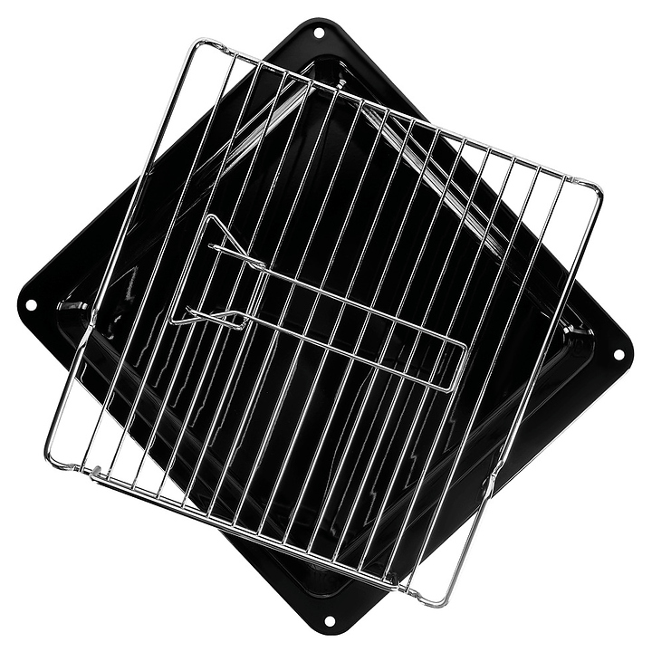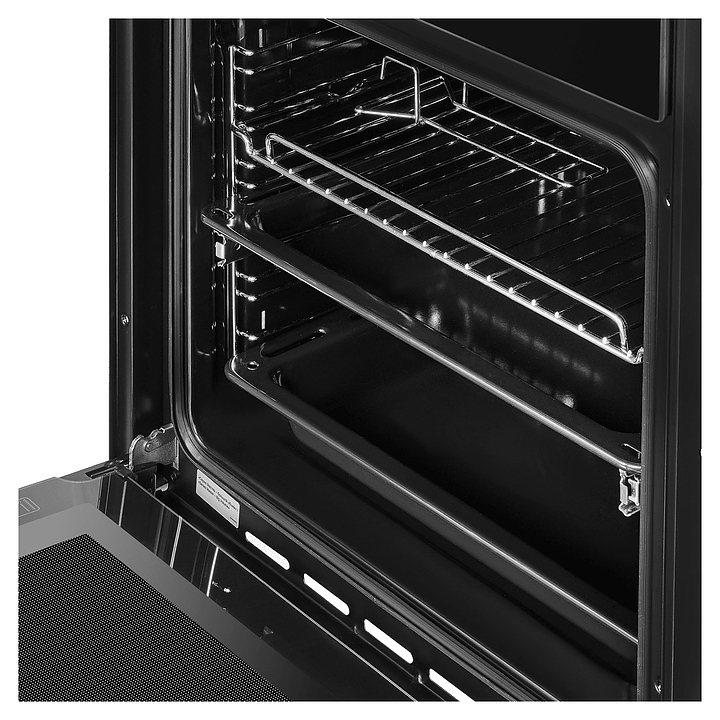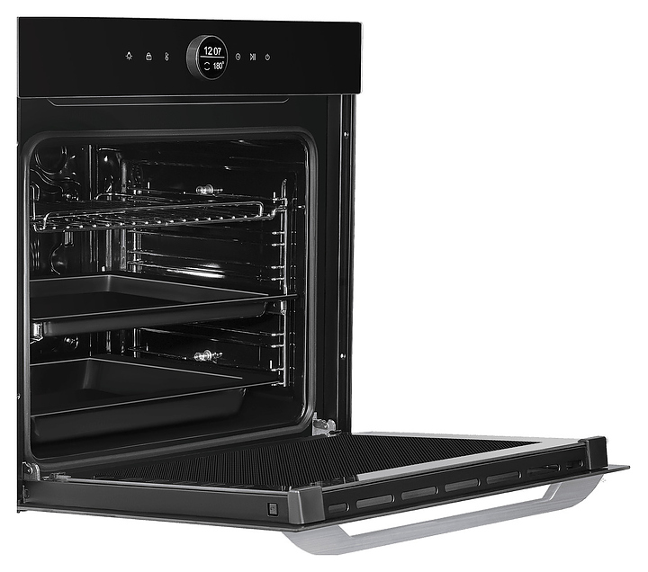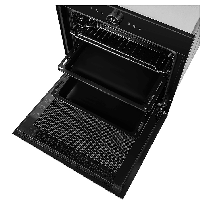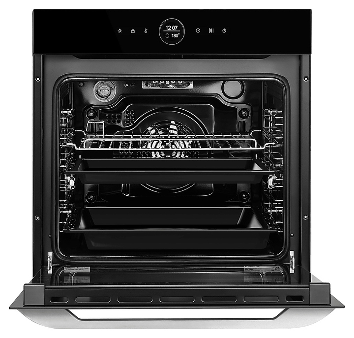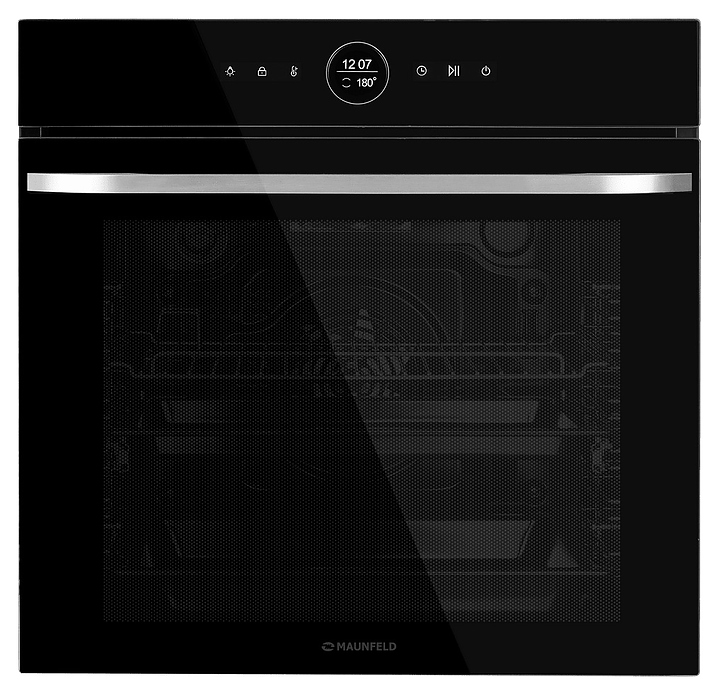 Встраивамый электрический духовой шкаф Maunfeld EOEH7616B предназначен для приготовления большого ассортимента блюд в домашних условиях. Модель оснащена камерой с расположенными в задней стенке кольцевым нагревательным элементом и вентилятором, верхним и нижним нагревательными элементами, верхним грилем, 2 боковыми стойками с 5 уровнями направляющих для противней, откидной дверью со смотровым окном, горизонтальной рукояткой, кабелем питания с вилкой, расположенной в верхней части фронта панелью управления с поворотно-нажимным цилиндрическим переключателем, сенсорными функциональными клавишами и информативным дисплеем с белой подсветкой индикации на лицевой панели переключателя. Корпус выполнен из высококачественной стали с покрытием фронта черного цвета и полным остеклением фронтальных панелей без винтового крепежа прозрачным стеклом с дымчатой тонировкой, боковые стойки, телескопические направляющие, решетка для гриля и прихват – из стали с хромированной поверхностью, противни – из стали с эмалированным покрытием, рукоятка – из металла с сатинированной поверхностью цвета нержавеющей стали.