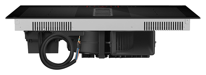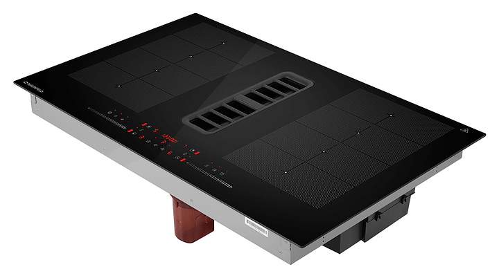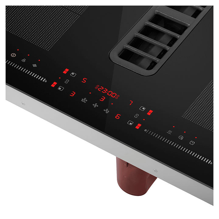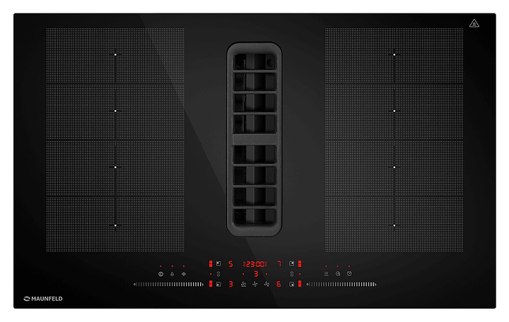 Индукционная варочная панель Maunfeld MIHC834SF2BK предназначена для приготовления большого ассортимента блюд в домашних условиях. Принцип работы основан на непосредственном нагреве металлической посуды создаваемыми высокочастотным магнитным полем индуцированными вихревыми токами. Модель оснащена 4 варочными зонами, интегрированной вытяжкой с расположенной в центре рабочей поверхности прямоугольной воздухозаборной решеткой, кабелем питания, фронтальной сенсорной панелью управления и 6 светодиодными цифровыми дисплеями с красной подсветкой индикации. Рабочая поверхность выполнена из высококачественной стеклокерамики черного цвета с прямой кромкой, решетка вытяжки – из стали с черной поверхностью, жироулавливающий фильтр – из алюминия.