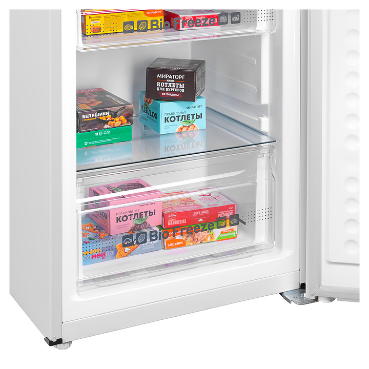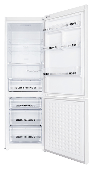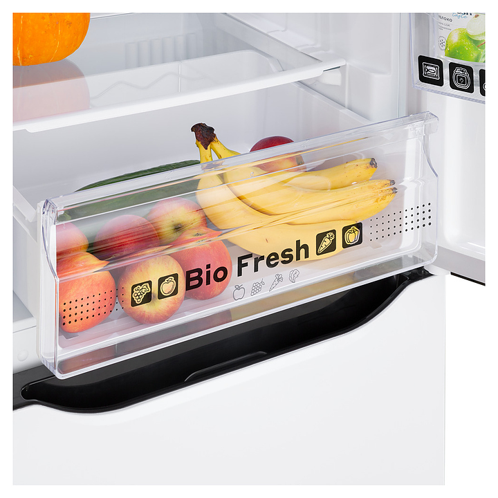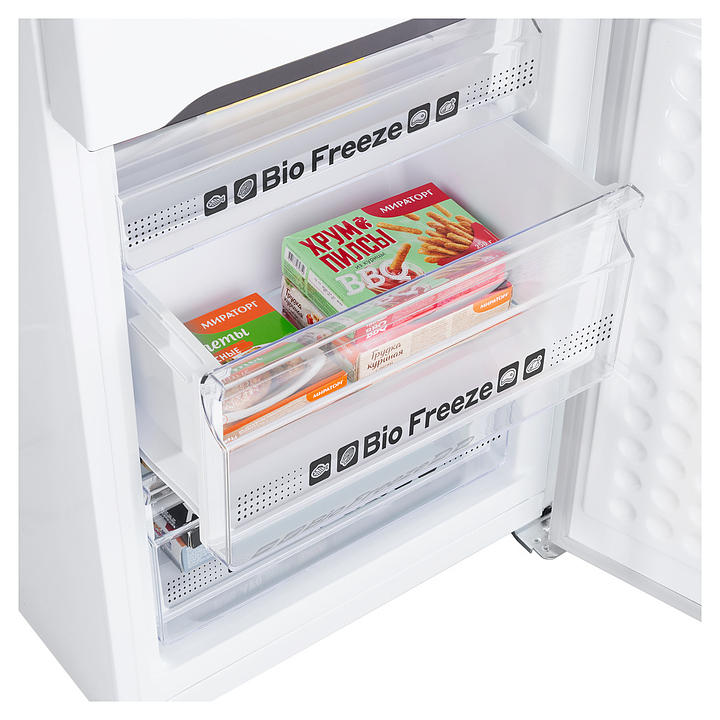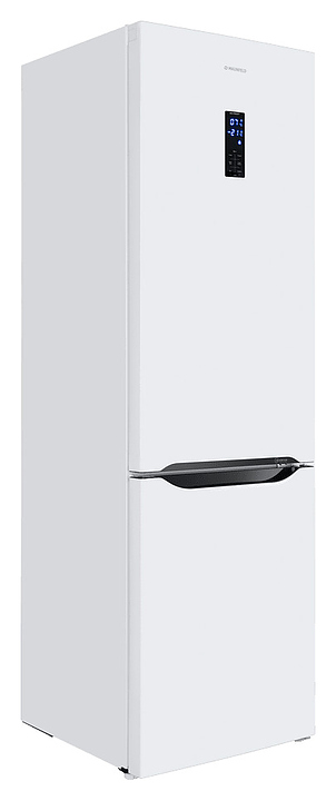 Холодильник Maunfeld MFF195NFIW10 предназначен для охлаждения, замораживания, кратковременного и длительного хранения пищевых продуктов и напитков в гостиничных комплексах, офисах, а также домашних условиях. Модель оснащена холодильной камерой сверху, морозильной камерой снизу, правосторонними распашными дверьми на перенавешиваемых петлях, кабелем питания с евровилкой и расположенной в верхней части фронта верхней двери панелью управления с сенсорными функциональными клавишами, светодиодными сигнальными лампами и 2 цифровыми дисплеями с голубой подсветкой индикации. Фасад и боковины выполнены из стали с антикоррозийным покрытием белого цвета, внутренняя облицовка камер – из белого антибактериального пластика легкой очистки, панель управления с черной глянцевой поверхностью, плоские полки – из прозрачного безопасного закаленного стекла с металлической окантовой серебристого оттенка, навесные полки – из прозрачного пластика, ящики – из белого пластика с прозрачным фронтом, упаковка – из гофрокартона, полимерной пленки и полистирола.