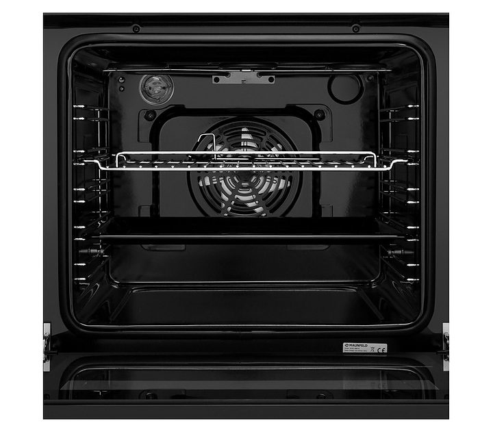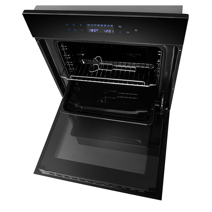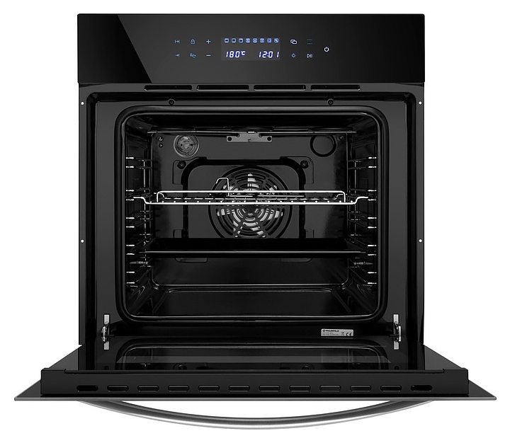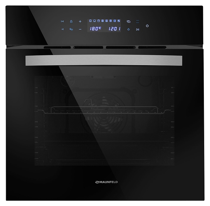 Встраивамый электрический духовой шкаф Maunfeld EOEC.566TB предназначен для приготовления большого ассортимента блюд в домашних условиях. Модель оснащена камерой с расположенным в задней стенке вентилятором, верхним и нижним нагревательными элементами, верхним грилем, 2 боковыми стойками с 5 уровнями направляющих для противней, откидной дверью со смотровым окном, уплощенной дугообразной горизонтальной рукояткой, кабелем питания с вилкой, расположенной в верхней части фронта панелью управления с сенсорными функциональными клавишами и информативным дисплеем с белой подсветкой индикации. Корпус выполнен из высококачественной стали, фронт с покрытием черного цвета и полным остеклением без винтового крепежа прозрачным закаленным стеклом с дымчатой тонировкой, боковые стойки, решетка для гриля и прихват – из металла с хромированной поверхностью, противень – из стали с эмалированным покрытием, рукоятка – из металла с сатинированной поверхностью цвета нержавеющей стали.
