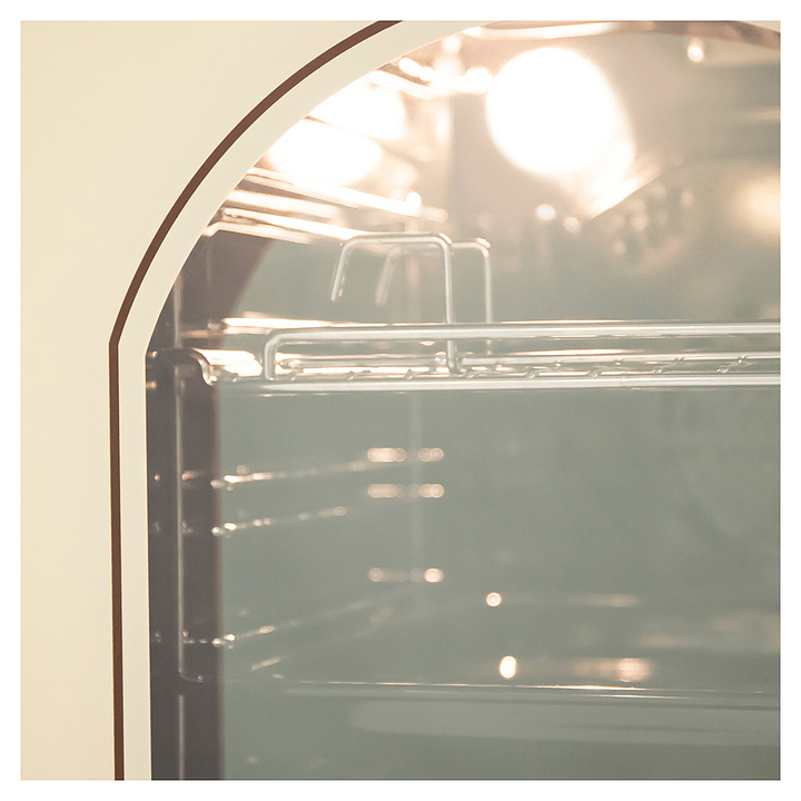 Встраивамый электрический духовой шкаф Maunfeld EOEF516RIB предназначен для приготовления большого ассортимента блюд в домашних условиях. Модель оснащена камерой с расположенным в задней стенке вентилятором, верхним и нижним нагревательными элементами, верхним грилем, боковыми стойками с 5 уровнями направляющих для противней, откидной дверью с фигурным смотровым окном, трубчатой горизонтальной рукояткой, кабелем питания с евровилкой, расположенной в верхней части фронта панелью управления с 2 поворотными переключателями и круглым циферблатом. Корпус выполнен из высококачественной стали, фронт с покрытием бежевого оттенка и полным остеклением без винтового крепежа прозрачным закаленным стеклом, боковые стойки, решетка для гриля и прихват для противней – из металла с хромированной поверхностью, противень – из стали с эмалированным покрытием, рукоятка и переключатели – из металла с поверхностью под состаренную бронзу и декоративными фигурными наконечниками, окантовка по периметру окна бронзового оттенка. Комплектация:
