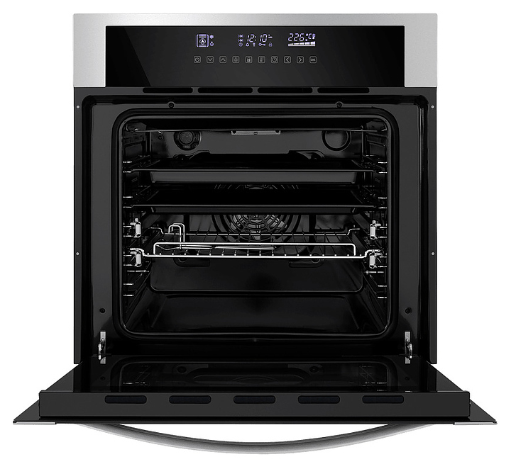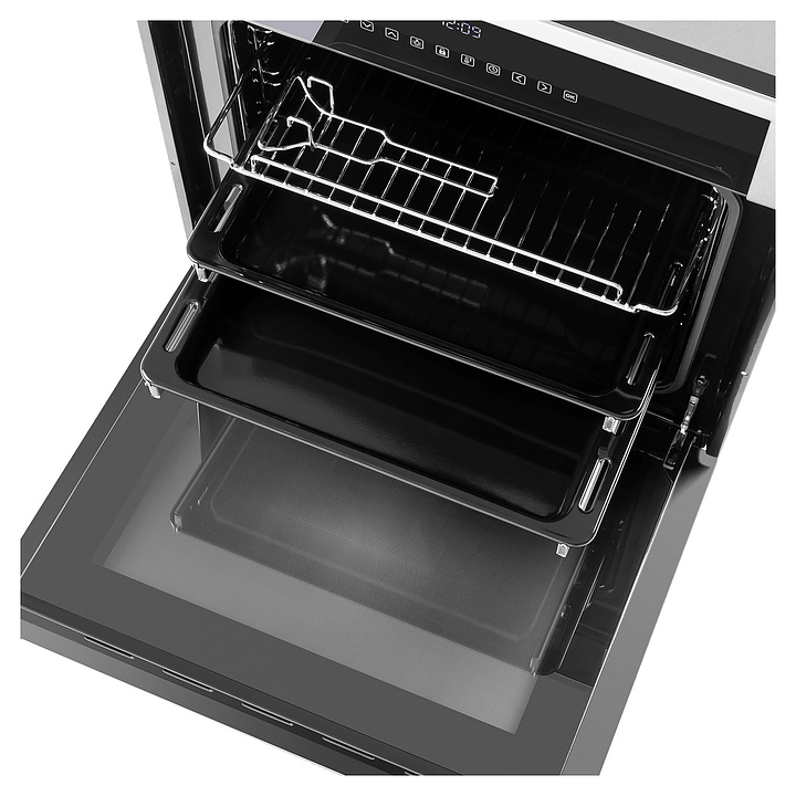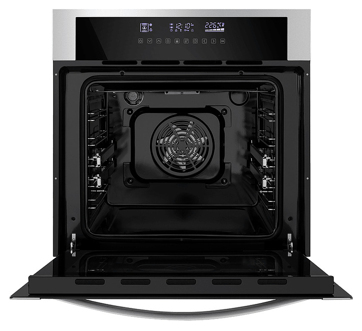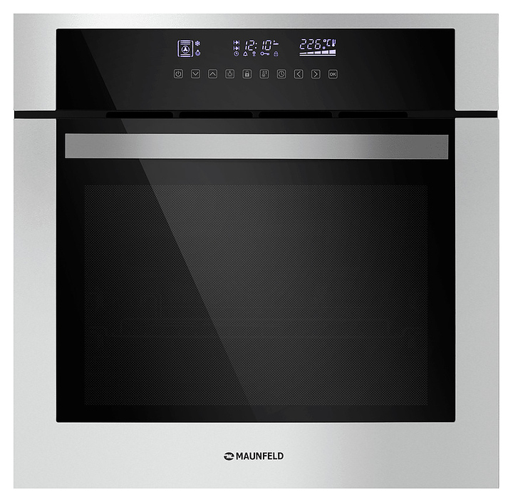 Встраивамый электрический духовой шкаф Maunfeld 5811S1 предназначен для приготовления большого ассортимента блюд в домашних условиях. Модель оснащена камерой с расположенными в задней стенке кольцевым нагревательным элементом и вентилятором, верхним и нижним нагревательными элементами, верхним грилем, 2 боковыми стойками с 5 уровнями направляющих для противней, откидной дверью со смотровым окном, уплощенной дугообразной горизонтальной рукояткой, кабелем питания с евровилкой, расположенной в верхней части фронта панелью управления с сенсорными функциональными клавишами и информативным дисплеем с белой подсветкой индикации. Корпус выполнен из высококачественной стали, верхняя фронтальная панель и фронт двери с покрытием черного цвета и частичным остеклением без винтового крепежа прозрачным закаленным стеклом с дымчатой тонировкой, боковые стойки, телескопические направляющие, решетка для гриля и прихват – из металла с хромированной поверхностью, противни – из стали с эмалированным покрытием, рамка по периметру фронта и рукоятка – из металла с матовой поверхностью цвета нержавеющей стали.