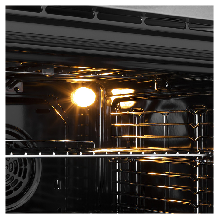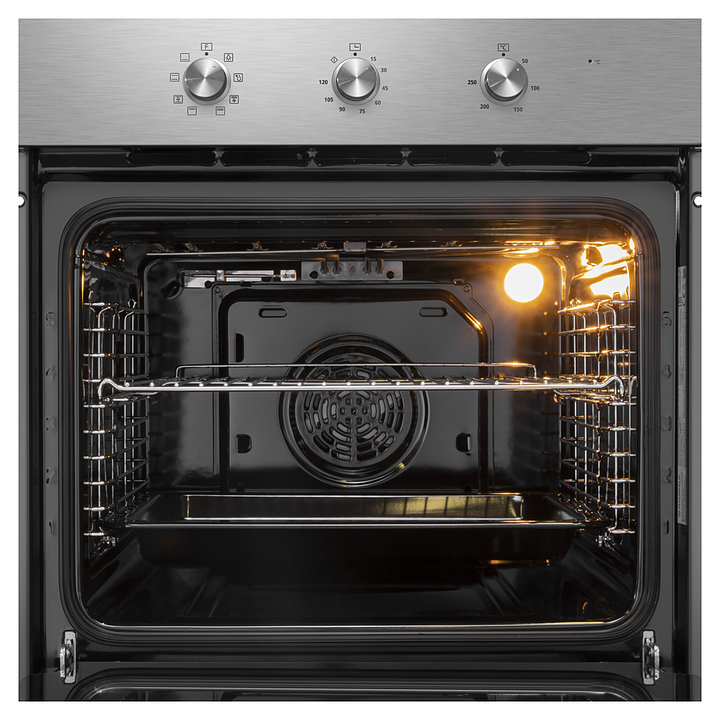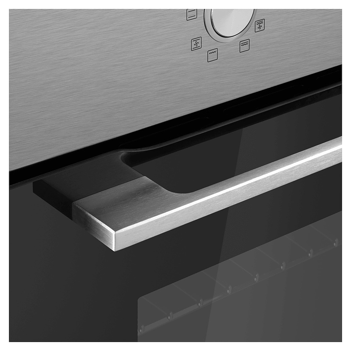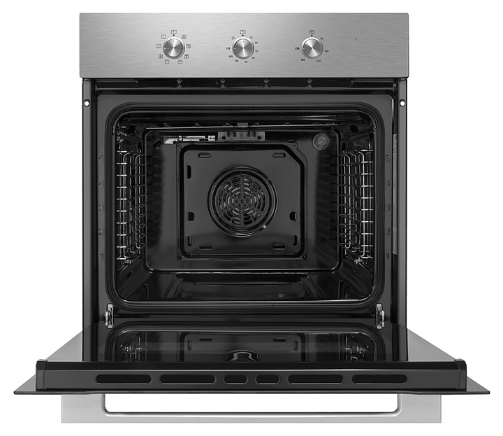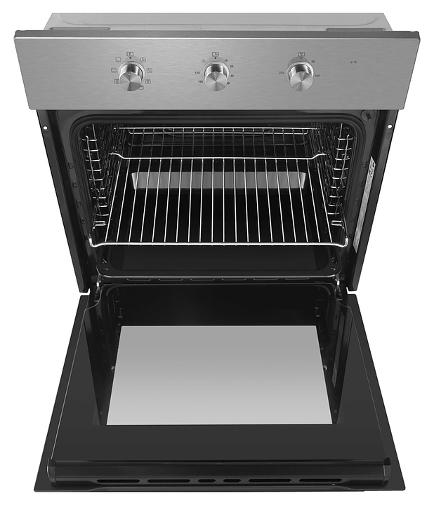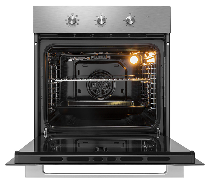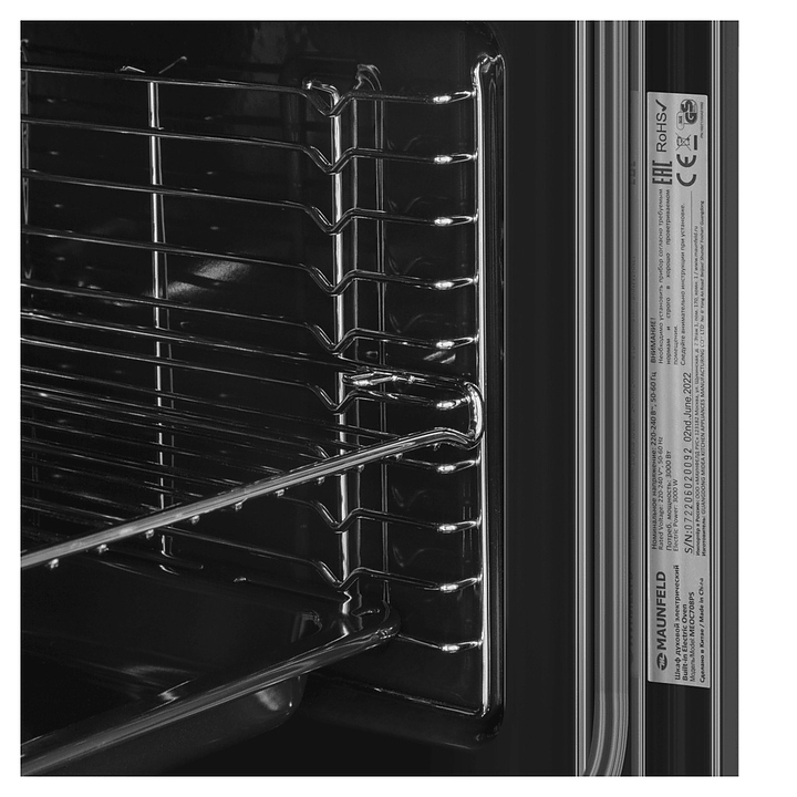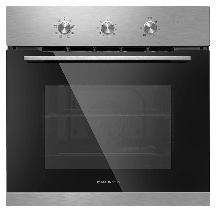 Встраивамый электрический духовой шкаф Maunfeld MEOC708PS предназначен для приготовления большого ассортимента блюд в домашних условиях. Модель оснащена камерой с расположенным в задней стенке вентилятором, верхним и нижним нагревательными элементами, верхним грилем, боковыми стойками с 5 уровнями направляющих для противней, откидной дверью со смотровым окном, уплощенной горизонтальной рукояткой, кабелем питания с евровилкой, расположенной в верхней части фронта панелью управления с 3 поворотными цилиндрическими переключателями. Корпус выполнен из высококачественной стали, фронт двери с покрытием черного цвета и частичным остеклением фронтальных панелей без винтового крепежа прозрачным закаленным стеклом, боковые стойки и решетка для гриля – из металла с хромированной поверхностью, противень – из стали с эмалированным покрытием, верхняя фронтальная панель, горизонтальная вставка в нижней части двери, рукоятка и переключатели – из металла с матовой поверхностью цвета нержавеющей стали. Комплектация: