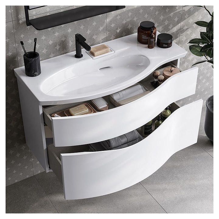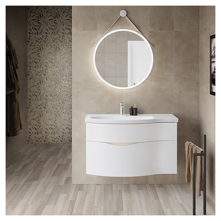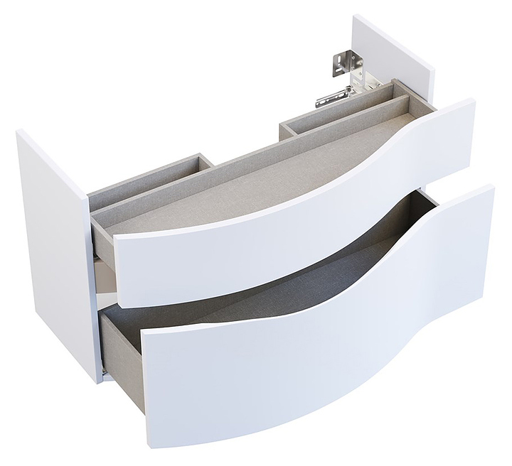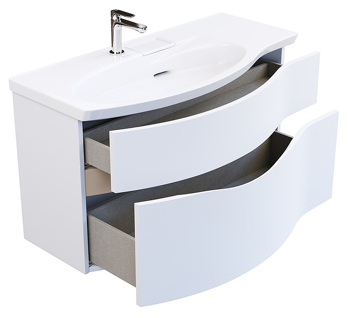 Левосторонняя тумба под раковину Kerama Marazzi Riva RV.100Lh\WHT.M выполнена в современном стиле и идеально впишется в интерьер любой ванной комнаты. Благодаря подвесной конструкции модель не занимает много места и облегчает уборку. Тумба оснащена 2 выдвижными ящиками и врезной ручкой. Фасад выполнен из фанеры. Раковина и смеситель в комплект поставки не входят. Тумба используется с раковиной Riva RV.wb.100Lh. Дополнительные характеристики: