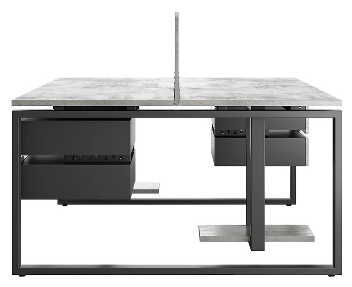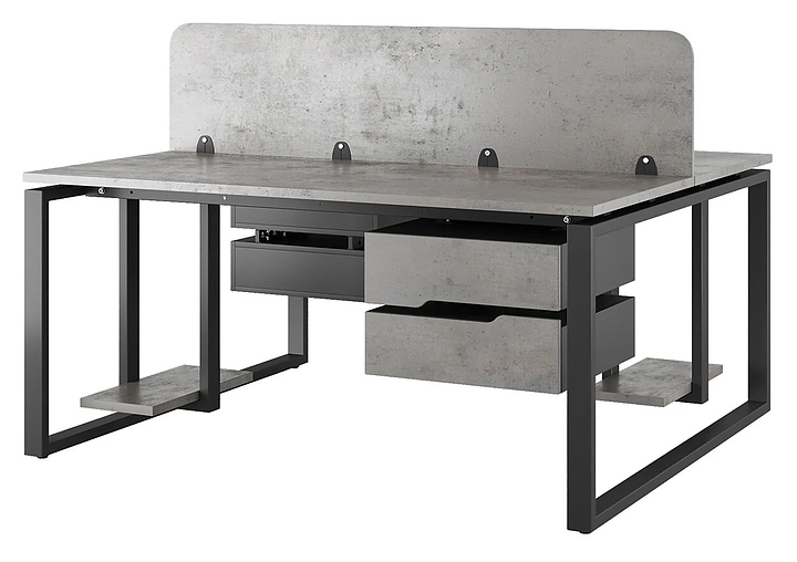 Офисный стол Кобор O1/2-160/160 black/chicago на 2 рабочих места используется в офисных помещениях и кабинетах руководителей. Модель оснащена O-образными опорами. Каркас и опоры выполнены из металла, выкрашенного в цвет черный муар (RAL9005), столешница – из ламинированной древесно-стружечной плиты (ЛДСП) цвета бетон чикаго (F186 ST9). Дополнительные характеристики: