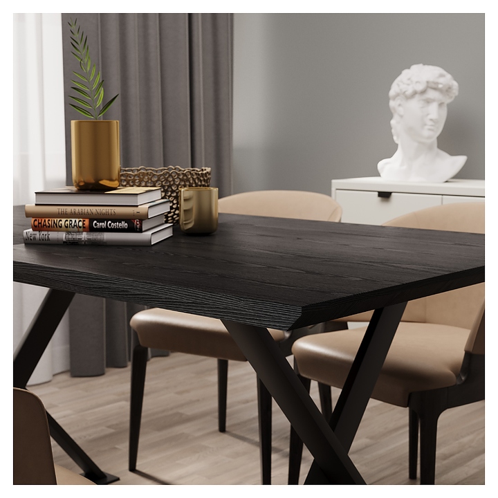 Обеденный стол Hesby Serene Cadence используется для оформления интерьера на предприятиях общественного питания и в домашних условиях. Модель оснащена прямоугольной столешницей и устойчивым подстольем с 2 Х-образными опорами на плоских основаниях. Столешница выполнена из ламинированной древесноволокнистой плиты средней плотности (ЛМДФ) с влагостойкой матовой поверхностью под дерево в черных тонах, подстолье – из металлического профиля с покрытием черного цвета. В комплект поставки входят 6-гранный ключ, крепеж и инструкция по сборке. Особенности: