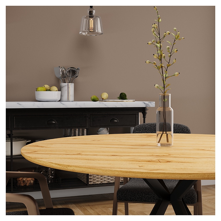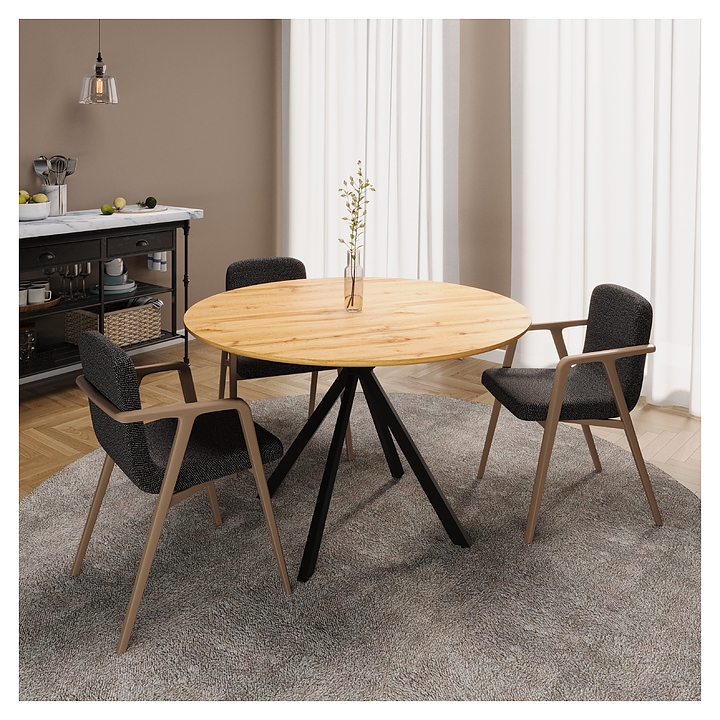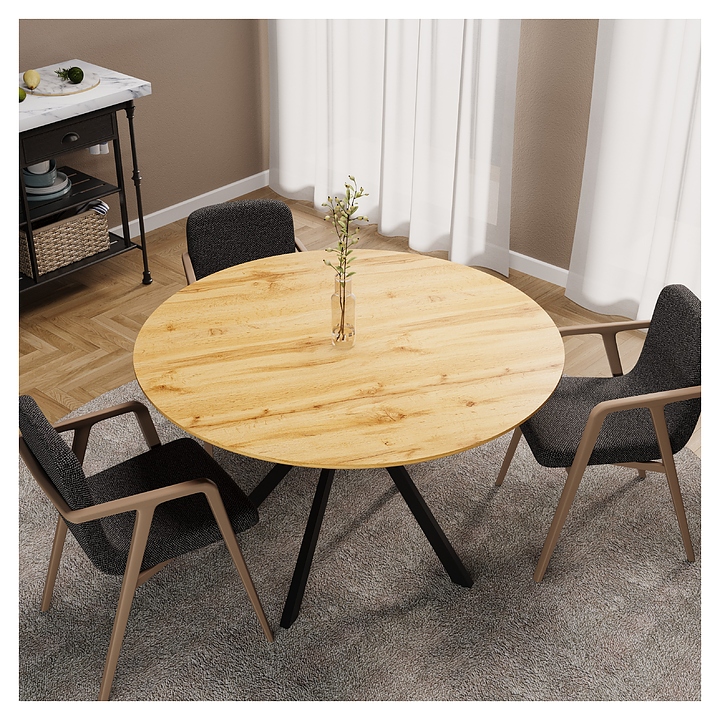 Обеденный стол Hesby Luminary Fusion используется для оформления интерьера на предприятиях общественного питания и в домашних условиях. Модель оснащена круглой столешницей и устойчивым подстольем с 4 наклонными опорами. Столешница выполнена из ламинированной древесноволокнистой плиты средней плотности (ЛМДФ) с влагостойкой матовой поверхностью под светлое дерево, подстолье – из металлического профиля с покрытием черного цвета. В комплект поставки входят 6-гранный ключ, крепеж и инструкция по сборке. Особенности: