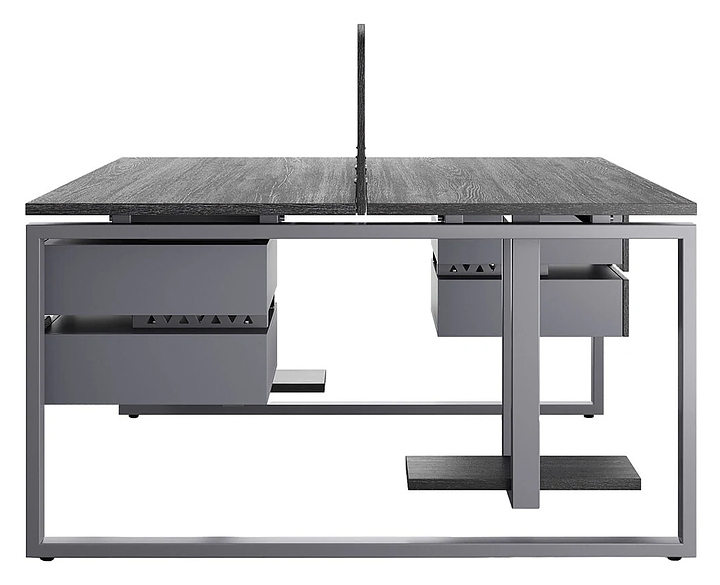 Офисный стол Кобор O1/2-120/160 graphite/glazed на 2 рабочих места используется в офисных помещениях и кабинетах руководителей. Модель оснащена O-образными опорами. Каркас и опоры выполнены из металла, выкрашенного в цвет графит муар (RAL7024), столешница – из ламинированной древесно-стружечной плиты (ЛДСП) цвета черный дуб (H3178 ST37). Дополнительные характеристики: