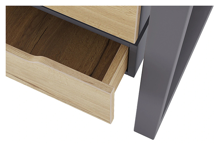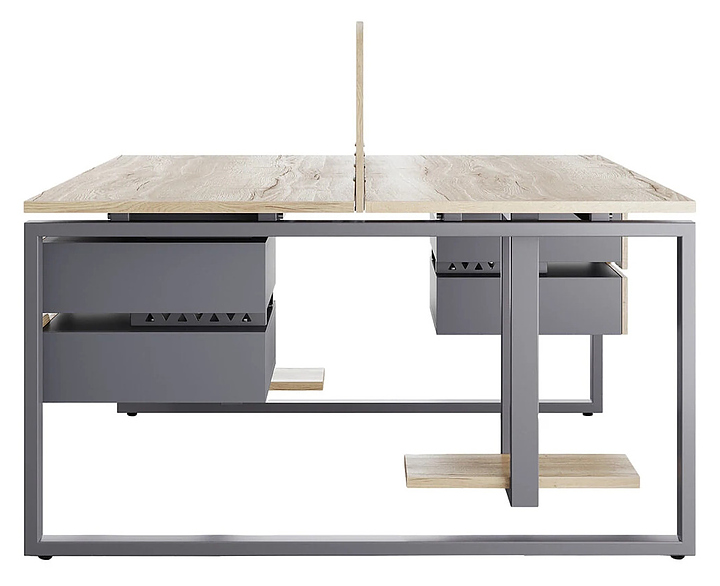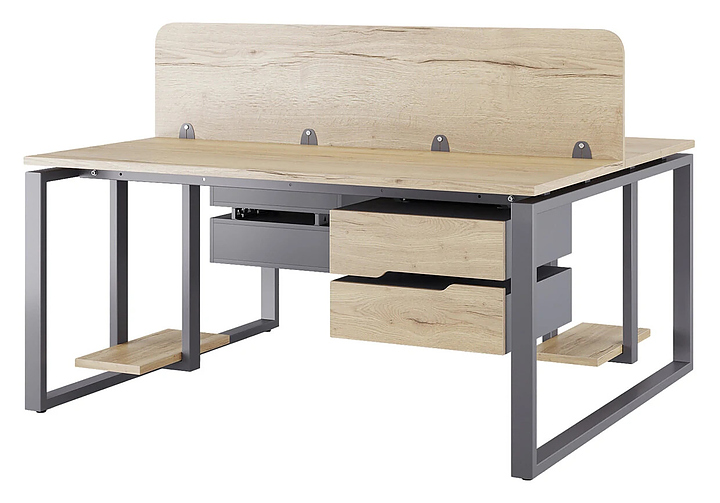 Офисный стол Кобор O1/2-160/140 graphite/natural на 2 рабочих места используется в офисных помещениях и кабинетах руководителей. Модель оснащена O-образными опорами. Каркас и опоры выполнены выполнены из металла, выкрашенного в цвет графит муар (RAL7024), столешница – из ламинированной древесно-стружечной плиты (ЛДСП) цвета натуральный дуб (H1180 ST37). Дополнительные характеристики: