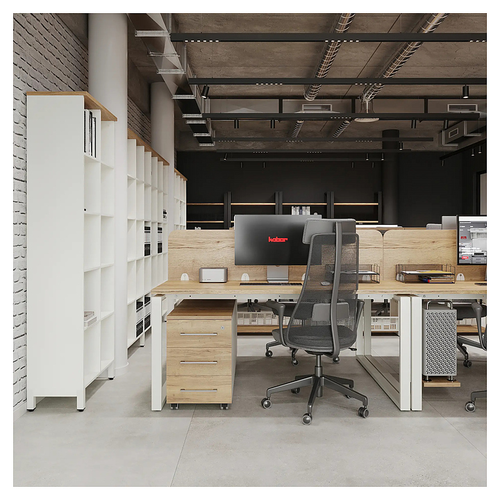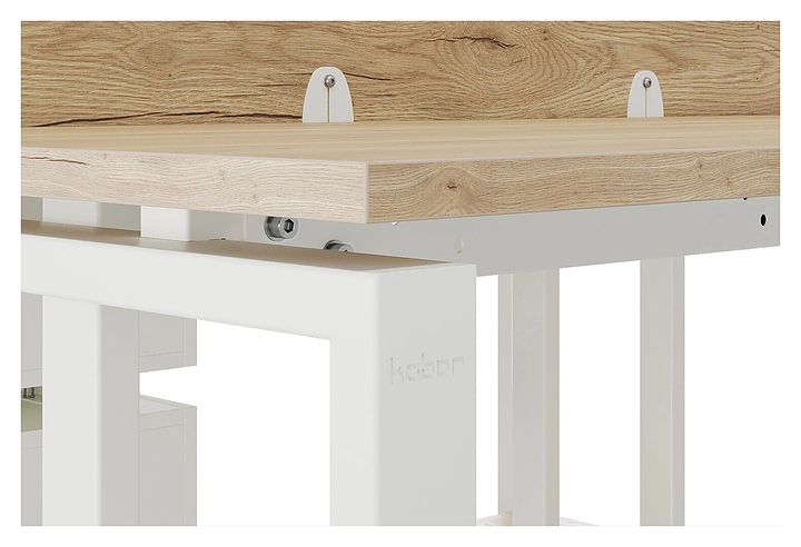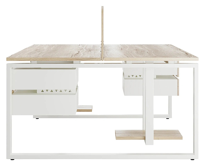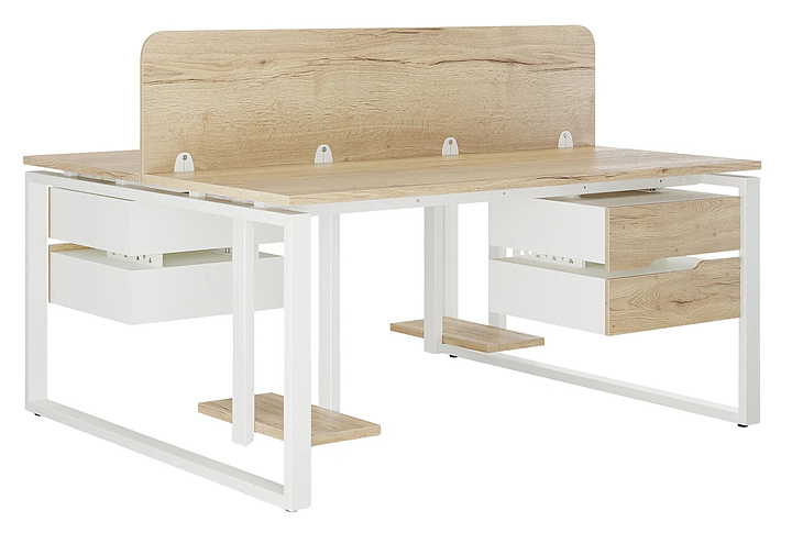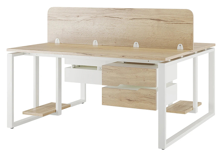 Офисный стол Кобор O1/2-160/140 white/natural на 2 рабочих места используется в офисных помещениях и кабинетах руководителей. Модель оснащена O-образными опорами. Каркас и опоры выполнены из металла, выкрашенного в цвет белый муар (RAL9016), столешница – из ламинированной древесно-стружечной плиты (ЛДСП) цвета натуральный дуб (H1180 ST37). Дополнительные характеристики: