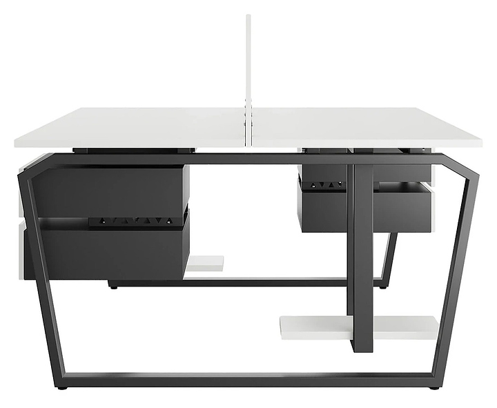 Офисный стол Кобор TB/2-160/160 black/premium на 2 рабочих места используется в офисных помещениях и кабинетах руководителей. Модель оснащена опорами в форме обратной трапеции со скошенными верхними углами. Каркас и опоры выполнены из металла, выкрашенного в цвет черный муар (RAL9005), столешница – из ламинированной древесно-стружечной плиты (ЛДСП) цвета белый премиум (W1000 ST9). Дополнительные характеристики:
