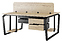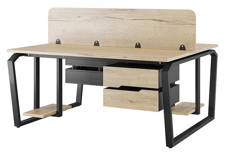 Офисный стол Кобор TB/2-160/140 black/natural на 2 рабочих места используется в офисных помещениях и кабинетах руководителей. Модель оснащена опорами в форме обратной трапеции со скошенными верхними углами. Каркас и опоры выполнены из металла, выкрашенного в цвет черный муар (RAL9005), столешница – из ламинированной древесно-стружечной плиты (ЛДСП) цвета натуральный дуб (H1180 ST37). Дополнительные характеристики: