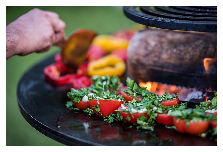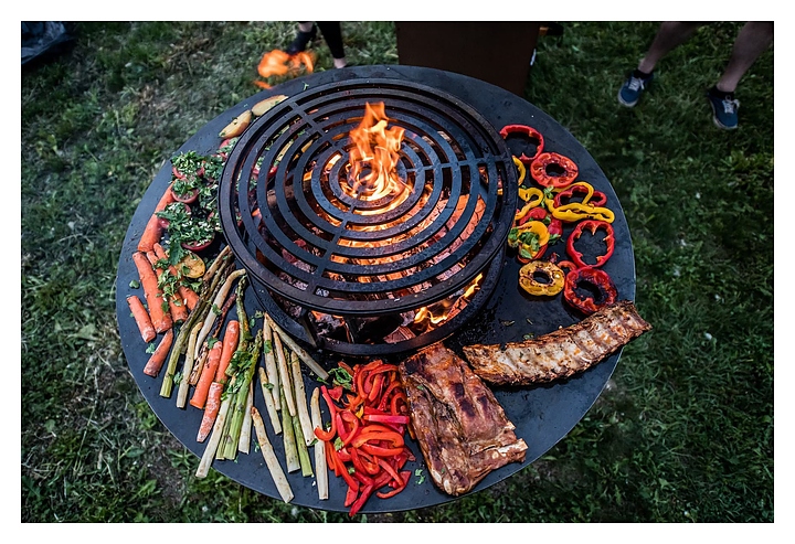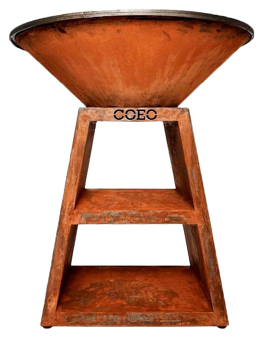 Уличный гриль COEO TRIO 98 серии Brasero используется на уличных площадках баров, кафе, других небольших предприятий общественного питания, кемпингов, частных домов и дач для жарки овощей, рыбы, приготовления шашлыка, а также различных тушеных блюд в чугунной посуде. Модель оснащена трапецевидной подставкой, конически расширенным кверху очагом и съемной круглой планчой с расположенной под небольшим наклоном к широкому отверстию в центре рабочей поверхностью. Подставка и очаг выполнены из высококачественной устойчивой к атмосферным воздействиям кортеновской стали (Corten) с характерной ржавой поверхностью, планча – из безопасной для пищевой продукции толстостенной стали с серебристой поверхностью. Комплектация: