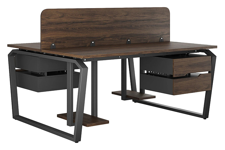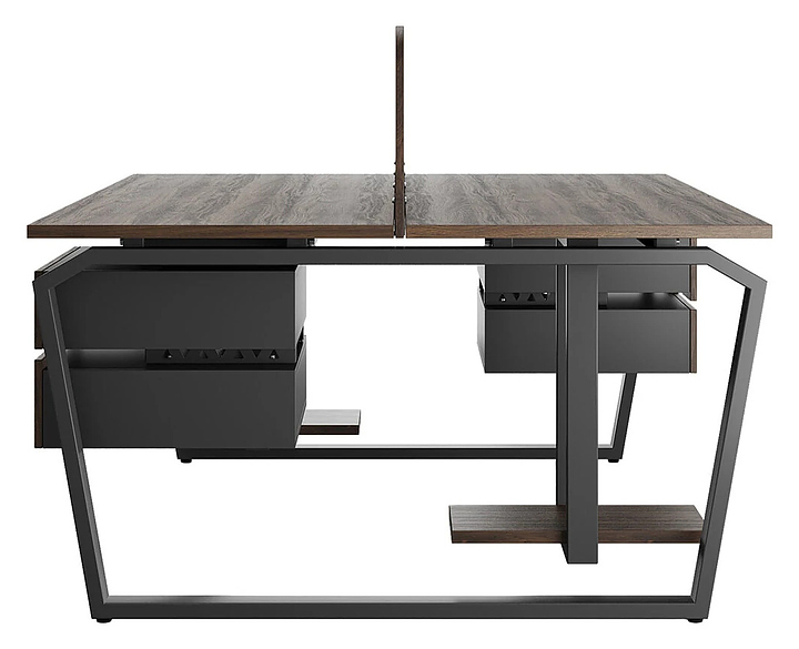 Офисный стол Кобор TB/2-160/160 black/charlston на 2 рабочих места используется в офисных помещениях и кабинетах руководителей. Модель оснащена опорами в форме обратной трапеции со скошенными верхними углами. Каркас и опоры выполнены из металла, выкрашенного в цвет черный муар (RAL9005), столешница – из ламинированной древесно-стружечной плиты (ЛДСП) цвета дуб чарльстон (H3154 ST36). Дополнительные характеристики: