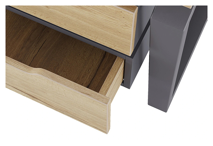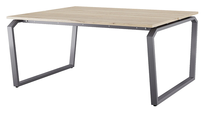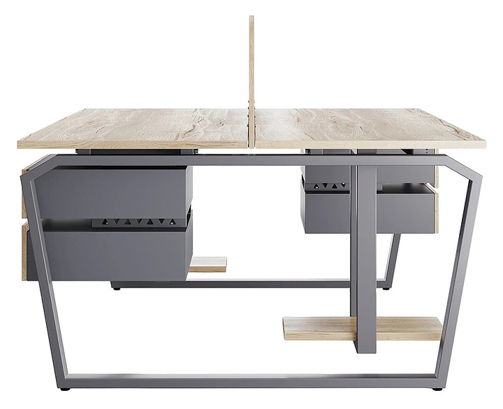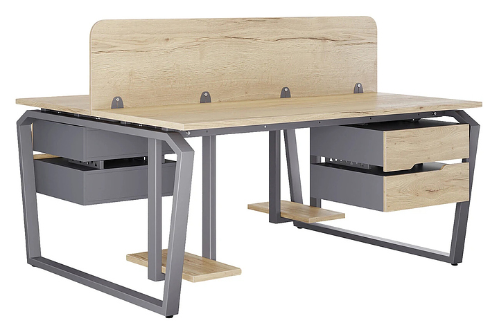 Офисный стол Кобор TB/2-140/120 graphite/natural на 2 рабочих места используется в офисных помещениях и кабинетах руководителей. Модель оснащена опорами в форме обратной трапеции со скошенными верхними углами. Каркас и опоры выполнены из металла, выкрашенного в цвет графит муар (RAL7024), столешница – из ламинированной древесно-стружечной плиты (ЛДСП) цвета натуральный дуб (H1180 ST37). Дополнительные характеристики: