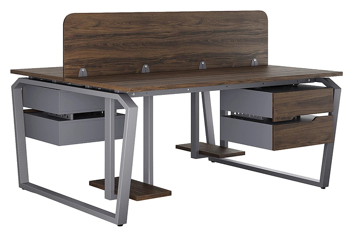 Офисный стол Кобор TB/2-160/160 graphite/charlston на 2 рабочих места используется в офисных помещениях и кабинетах руководителей. Модель оснащена опорами в форме обратной трапеции со скошенными верхними углами. Каркас и опоры выполнены из металла, выкрашенного в цвет графит муар (RAL7024), столешница – из ламинированной древесно-стружечной плиты (ЛДСП) цвета дуб чарльстон (H3154 ST36). Дополнительные характеристики: