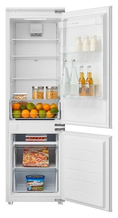 Встраиваемый холодильник HiSTORY BRB 1780M предназначен для охлаждения, замораживания, кратковременного и длительного хранения пищевых продуктов и напитков в гостиничных комплексах, офисах, а также домашних условиях. Модель оснащена холодильной камерой сверху и морозильной камерой снизу, правосторонними перенавешиваемыми распашными дверьми, кабелем питания с вилкой и расположенной на внутренней боковой стенке холодильной камеры панелью управления с функциональными сенсорными клавишами и светодиодными индикаторами. Фасад выполнен из предварительно окрашенной в белый цвет листовой стали (PCM), внутренняя облицовка камеры – из пластика белого цвета, плоские полки – из прозрачного закаленного стекла с металлическими окантовками с серебристой поверхностью, навесные полки – из прозрачного пластика, ящики – из белого пластика с прозрачным фронтом, ящик для мороженого – из белого пластика.