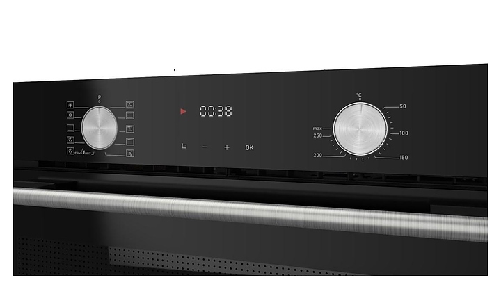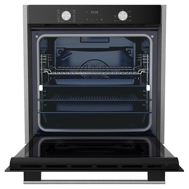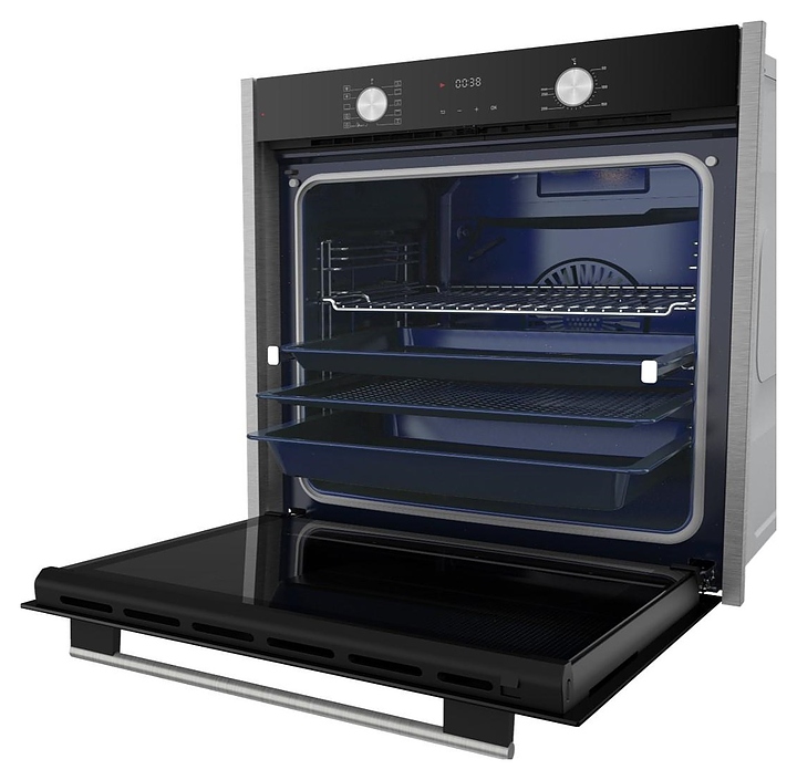 Встраивамый электрический духовой шкаф HiSTORY OEP8510P.FBK предназначен для приготовления большого ассортимента блюд в домашних условиях. Модель оснащена камерой с расположенными в задней стенке кольцевым нагревательным элементом и вентилятором, верхним и нижним нагревательными элементами, верхним грилем, боковыми стойками с 6 уровнями направляющих для противней, откидной дверью со смотровым окном, горизонтальной трубчатой рукояткой, кабелем питания с вилкой, расположенной в верхней части фронта электромеханической панелью управления с 2 поворотными цилиндрическими переключателями, сенсорными функциональными клавишами и светодиодным дисплеем с белой подсветкой индикации. Корпус выполнен из высококачественной стали, фасад двери и верхняя фронтальная панель с покрытием черного цвета и полным остеклением без винтового крепежа прозрачным закаленным стеклом с обработкой от пятен, вертикальные торцевые фасадные рамки – из нержавеющей стали с сатинированной серебристой поверхностью, боковые стойки, направляющие и решетка для гриля – из стали с хромированной поверхностью, противни – из стали с эмалированным покрытием, рукоятка – из нержавеющей стали марки AISI 304 EVA с матовой поверхностью, переключатели – из металла с серебристой поверхностью.
