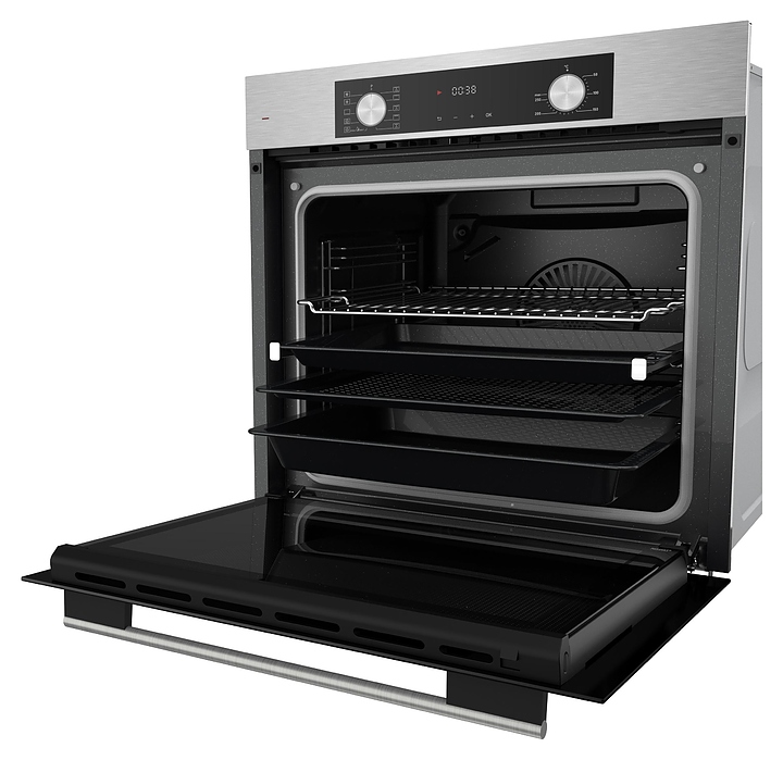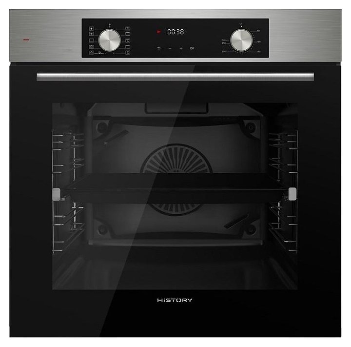 Встраивамый электрический духовой шкаф HiSTORY OE7710C.FIX предназначен для приготовления большого ассортимента блюд в домашних условиях. Модель оснащена камерой с расположенными в задней стенке кольцевым нагревательным элементом и вентилятором, верхним и нижним нагревательными элементами, верхним грилем, боковыми стойками с 6 уровнями направляющих для противней, откидной дверью со смотровым окном, горизонтальной трубчатой рукояткой, кабелем питания с вилкой, расположенной в верхней части фронта электромеханической панелью управления с 2 поворотными цилиндрическими переключателями, сенсорными функциональными клавишами и светодиодным дисплеем с белой подсветкой индикации. Корпус выполнен из высококачественной стали, фасад двери с покрытием черного цвета и полным остеклением без винтового крепежа прозрачным закаленным стеклом с обработкой от пятен, верхняя фронтальная панель – из нержавеющей стали с сатинированной серебристой поверхностью, боковые стойки, направляющие и решетка для гриля – из стали с хромированной поверхностью, противни – из стали с эмалированным покрытием, рукоятка – из нержавеющей стали марки AISI 304 EVA с матовой поверхностью, переключатели – из металла с серебристой поверхностью.