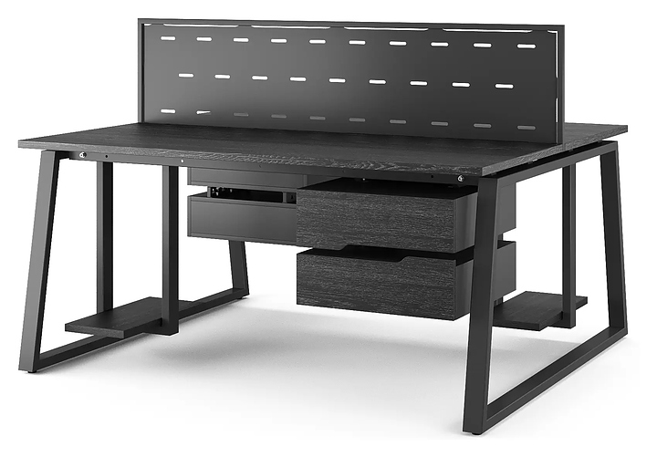 Офисный стол Кобор TR/2-180/140 black/glazed на 2 рабочих места используется в офисных помещениях и кабинетах руководителей. Модель оснащена опорами в форме трапеции. Каркас и опоры выполнены из металла, выкрашенного в цвет черный муар (RAL9005), столешница – из ламинированной древесно-стружечной плиты (ЛДСП) цвета черный дуб (H3178 ST37). Дополнительные характеристики: