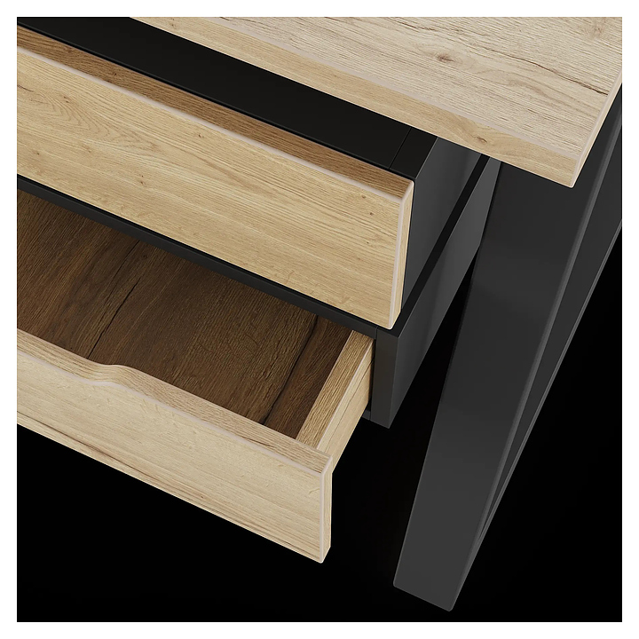 Офисный стол Кобор TR/2-160/140 black/natural на 2 рабочих места используется в офисных помещениях и кабинетах руководителей. Модель оснащена опорами в форме трапеции. Каркас и опоры выполнены из металла, выкрашенного в цвет черный муар (RAL9005), столешница – из ламинированной древесно-стружечной плиты (ЛДСП) цвета натуральный дуб (H1180 ST37). Дополнительные характеристики: