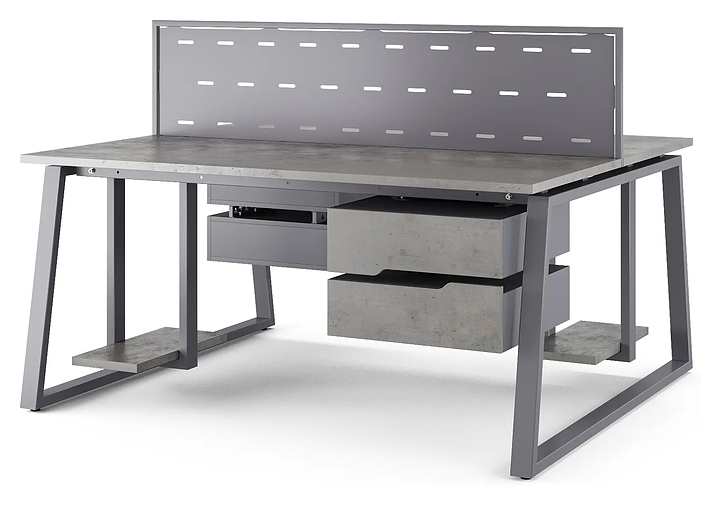 Офисный стол Кобор TR/2-140/160 graphite/chicago на 2 рабочих места используется в офисных помещениях и кабинетах руководителей. Модель оснащена опорами в форме трапеции. Каркас и опоры выполнены из металла, выкрашенного в цвет графит муар (RAL7024), столешница – из ламинированной древесно-стружечной плиты (ЛДСП) цвета бетон чикаго (F186 ST9). Дополнительные характеристики: