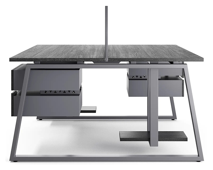 Офисный стол Кобор TR/2-180/160 graphite/glazed на 2 рабочих места используется в офисных помещениях и кабинетах руководителей. Модель оснащена опорами в форме трапеции. Каркас и опоры выполнены из металла, выкрашенного в цвет графит муар (RAL7024), столешница – из ламинированной древесно-стружечной плиты (ЛДСП) цвета черный дуб (H3178 ST37). Дополнительные характеристики: