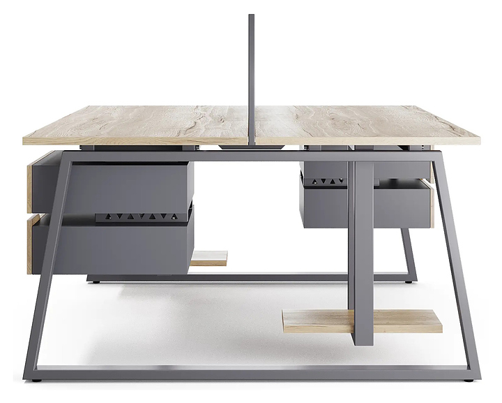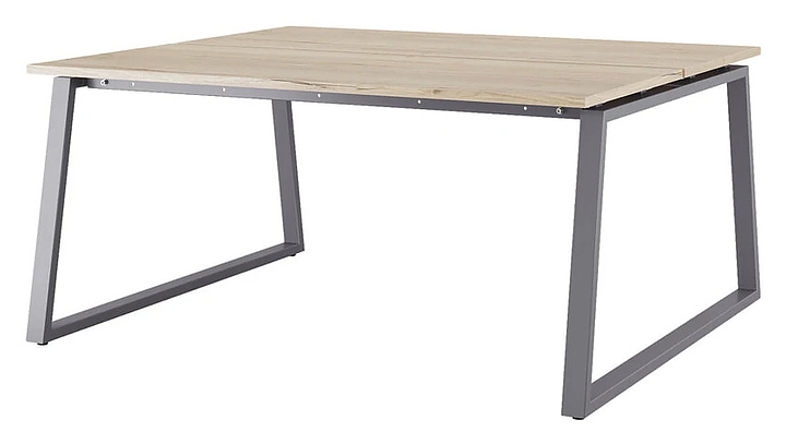 Офисный стол Кобор TR/2-180/120 graphite/natural на 2 рабочих места используется в офисных помещениях и кабинетах руководителей. Модель оснащена опорами в форме трапеции. Каркас и опоры выполнены из металла, выкрашенного в цвет графит муар (RAL7024), столешница – из ламинированной древесно-стружечной плиты (ЛДСП) цвета натуральный дуб (H1180 ST37). Дополнительные характеристики: