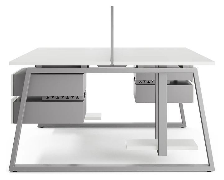 Офисный стол Кобор TR/2-160/140 aluminum/premium на 2 рабочих места используется в офисных помещениях и кабинетах руководителей. Модель оснащена опорами в форме трапеции. Каркас и опоры выполнены из металла, выкрашенного в цвет алюминиевый металлик (RAL9006), столешница – из ламинированной древесно-стружечной плиты (ЛДСП) цвета белый премиум (W1000 ST9). Дополнительные характеристики: