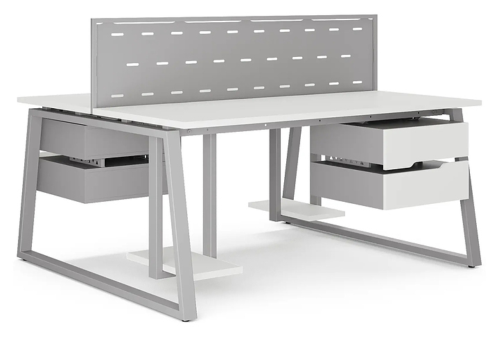 Офисный стол Кобор TR/2-180/140 aluminum/premium на 2 рабочих места используется в офисных помещениях и кабинетах руководителей. Модель оснащена опорами в форме трапеции. Каркас и опоры выполнены из металла, выкрашенного в цвет алюминиевый металлик (RAL9006), столешница – из ламинированной древесно-стружечной плиты (ЛДСП) цвета белый премиум (W1000 ST9). Дополнительные характеристики: