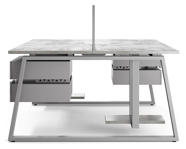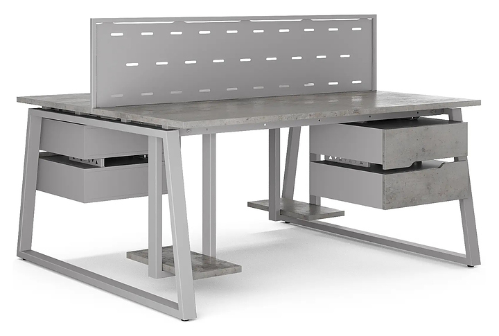 Офисный стол Кобор TR/2-100/120 aluminum/chicago на 2 рабочих места используется в офисных помещениях и кабинетах руководителей. Модель оснащена опорами в форме трапеции. Каркас и опоры выполнены из металла, выкрашенного в цвет алюминиевый металлик (RAL9006), столешница – из ламинированной древесно-стружечной плиты (ЛДСП) цвета бетон чикаго (F186 ST9). Дополнительные характеристики: