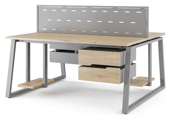 Офисный стол Кобор TR/2-180/120 aluminum/natural на 2 рабочих места используется в офисных помещениях и кабинетах руководителей. Модель оснащена опорами в форме трапеции. Каркас и опоры выполнены из металла, выкрашенного в цвет алюминиевый металлик (RAL9006), столешница – из ламинированной древесно-стружечной плиты (ЛДСП) цвета натуральный дуб (H1180 ST37). Дополнительные характеристики: