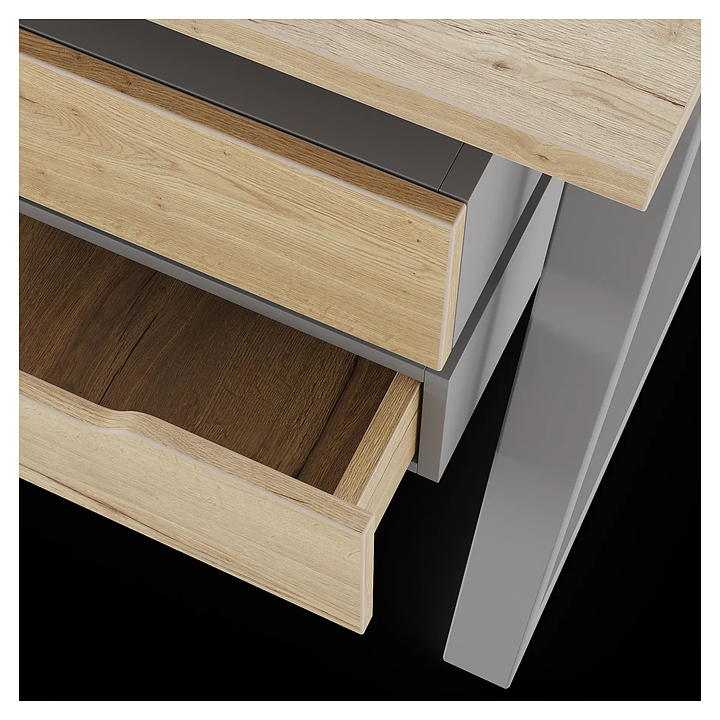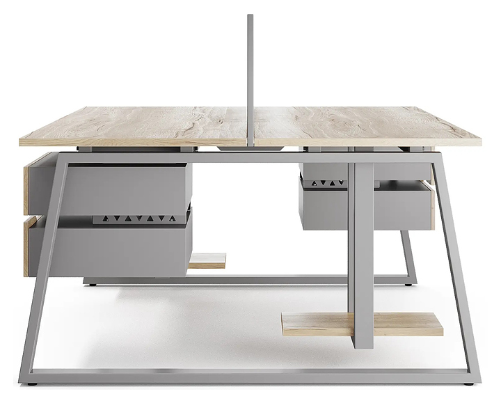 Офисный стол Кобор TR/2-140/140 aluminum/natural на 2 рабочих места используется в офисных помещениях и кабинетах руководителей. Модель оснащена опорами в форме трапеции. Каркас и опоры выполнены из металла, выкрашенного в цвет алюминиевый металлик (RAL9006), столешница – из ламинированной древесно-стружечной плиты (ЛДСП) цвета натуральный дуб (H1180 ST37). Дополнительные характеристики: